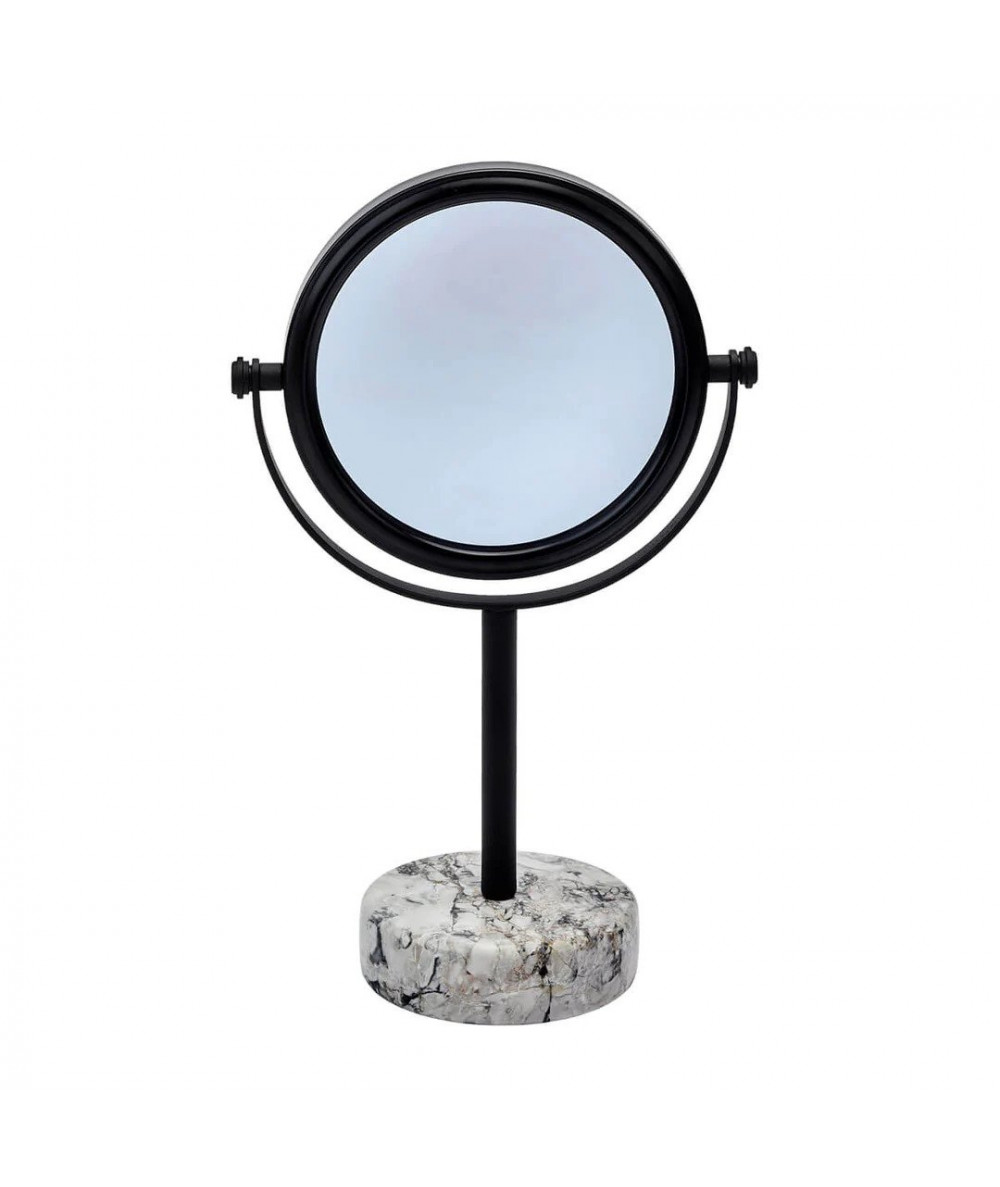 Det flotte makeup spejl er en del af Nero badeværelsesserien bestående af toiletbørste, dispenser, sæbeskål, bakke og tandkrus. Derfor kan du køre hele serien igennem som en rød tråd på badeværelset. Det vil give et smukt og elegant udtryk. Du kan også vælge at have spejlet stående i soveværelset, eller hvor du nu ønsker at gøre brug af det. Spejlet er lavet i hvid natursten, hvilket gør spejlet unikt, da der ikke er to der er ens. Spejlet har en rund bund, som stilles på bordet, resten af spejlet er lavet i sort rustfrit stål og har en forstørrelse på x3. Spejlet ruster ikke.