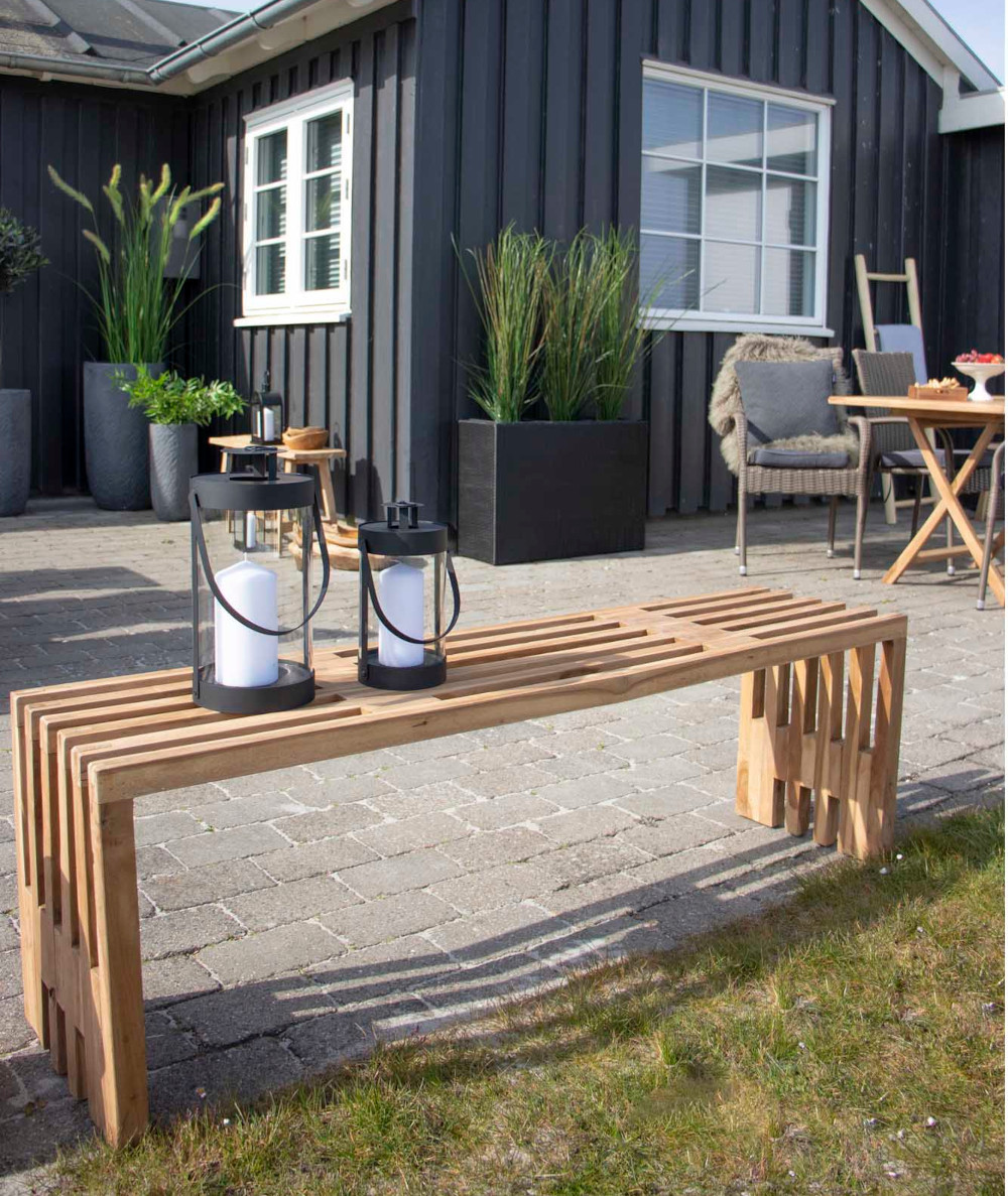 Den fine Benidorm bænk er fra House nordic og er lavet i teaktræ. Designet er enkelt og stilrent og kan bruges både inde og ude. Bænken er fremstillet i genbrugstræ og har et moderne touch. Hyg op med planter og lanterner og skab skøn stemning på terrassen eller i din stue. Elsker du den rustikke indretning så kunne denne bænk måske være noget for dig.