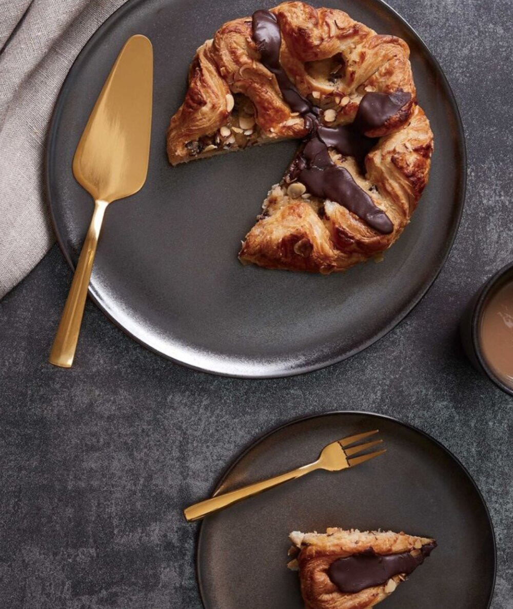 Når desserten skal serveres, skal det selvfølgelig gøres med stil. Dette flotte kagesæt i guld fra Aida RAW serien, passer sammen med resten af bestik serien i guld. Sættet indeholder 4 kagegafler i guld, samen en kagespade. Køb eventuelt flere kagegafler særskilt, som kan bruges sammen med dette flotte sæt.