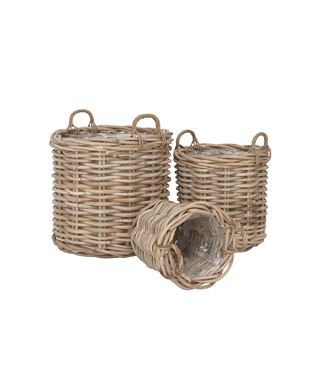 De tre kurve varierer i størrelse, så du får fleksibel opbevaring til ethvert behov. Det robuste rattanmateriale sikrer holdbarhed, mens de stilfulde håndtag gør det nemt at flytte kurvene rundt i hjemmet – eller haven.