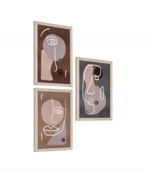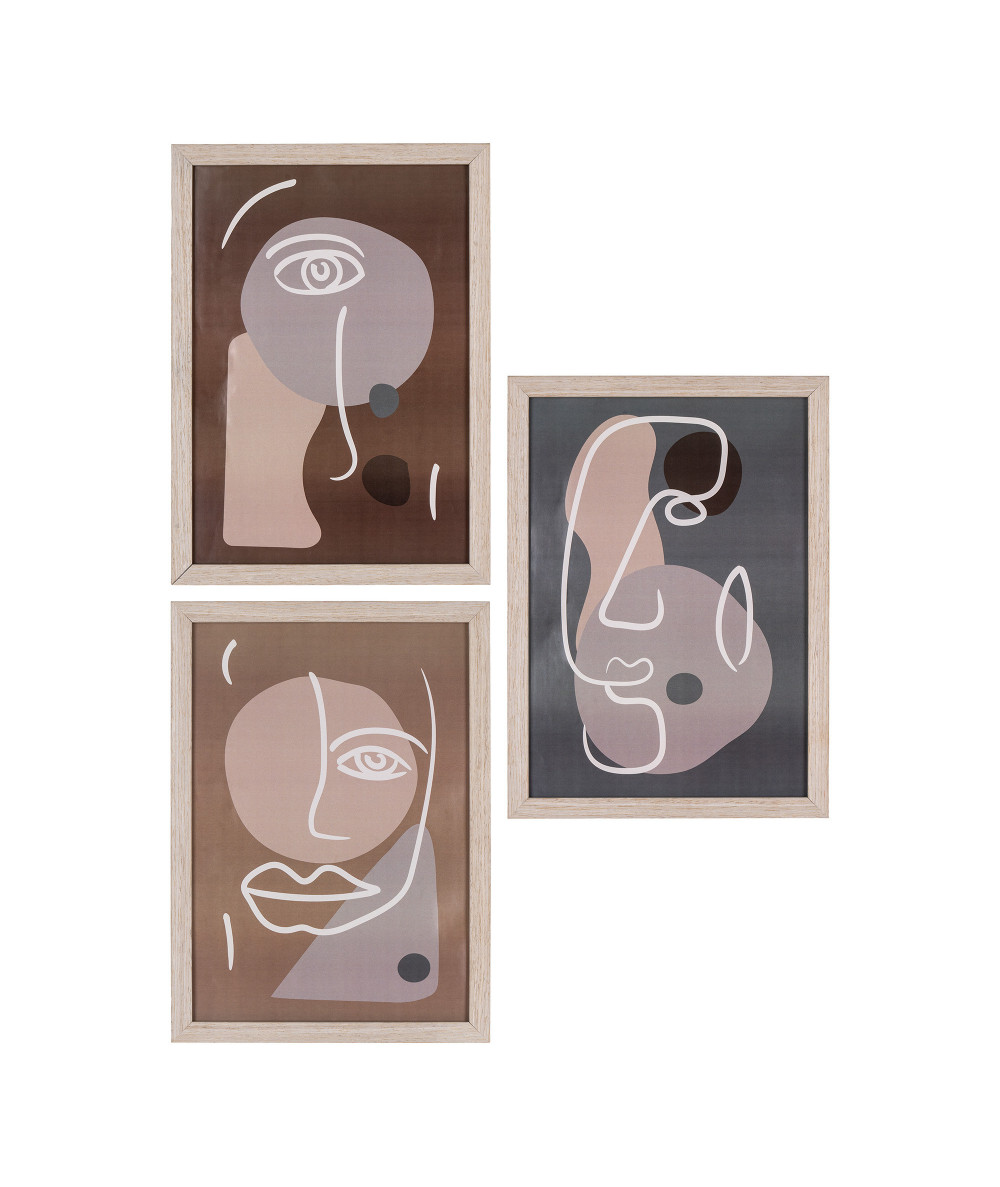 De fine Catharine rammesæt består af 3 rammer. Rammerne har en natur farve, som gør, at de passer flot ind i den nordiske indretningsstil. i rammerne er der indsat billeder af grafiske ansigter i gyldne, grålige, rosa farver. De tre rammer måler 21x30 cm.