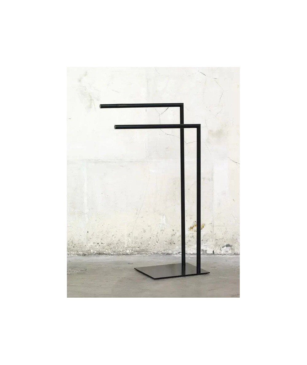 Den fine Epic håndklædeholder har et meget flot og iøjefaldende design. Det er en smuk håndklædeholder, som nærmest har et kunstnerisk udtryk. Håndklædeholderen har et enkelt og dekorativt udtryk, og ønsker du wellness stemning på badeværelset, så er den lige noget for dig. Håndklædeholderen er lavet i matbelagt metal, og står på gulvet. Den har to stænger, som du kan hænge dine håndklæder på og fås i farverne sort og hvid