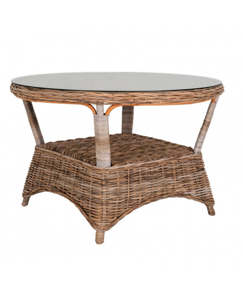 Larisa havemøbelsættet er fremstillet i rattan, stål og glas, hvilket giver en harmonisk kombination af robusthed og elegance. Det runde bord med en diameter på 120 cm har en elegant glasplade, der både fremhæver rattanens naturlige skønhed og gør bordet nemt at rengøre. De rummelige stole har en organisk form med buede armlæn og en dybde, der indbyder til komfort og afslapning.