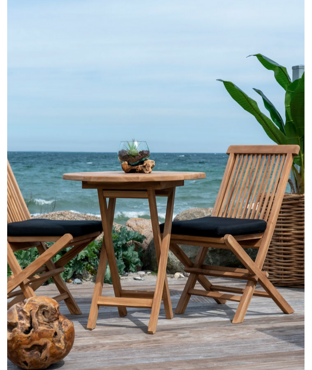 Sættet er fremstillet af teaktræ, der ikke blot giver et smukt og naturligt udtryk, men også sikrer en robust og vejrbestandig løsning til udendørs brug. Det naturlige træ udvikler en smuk patina over tid, hvilket giver møblerne endnu mere karakter.