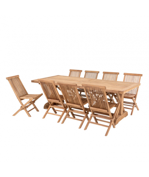 Med Volos & Toledo havemøbelsættet får du den perfekte kombination af luksus, holdbarhed og komfort. Dette elegante sæt er skabt til dem, der elsker at samle familie og venner til gode måltider og hyggelige stunder under åben himmel. Med et stort spisebord i massivt teaktræ og otte smukt designede spisebordsstole bliver enhver middag en oplevelse i sig selv.