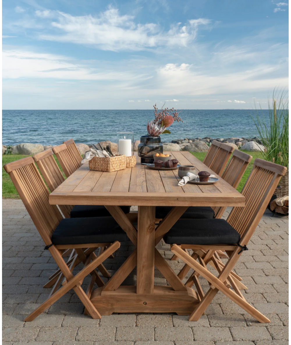 Teaktræ er kendt for sin naturlige modstandsdygtighed over for vind og vejr, hvilket gør dette havemøbelsæt til en investering, der holder i mange år. Med minimal vedligeholdelse kan du lade møblerne stå ude hele sæsonen og nyde deres smukke udtryk, uanset vejret.