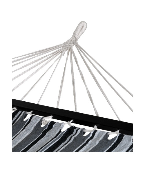 Forkæl dig selv med en hyggelig hængekøje hvor du kan tage en lur efter arbejde eller bare slappe af med en god bog. Læg dig til rette og lad dig indhylle i det bløde stof imens børnene leger i haven. Hængekøjen er lavet i polyester/bomuld i sorte, grålige og hvide farver.
