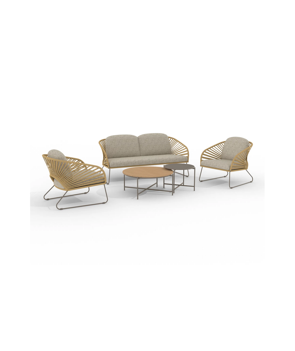 Novella loungesættet kombinerer moderne elegance og høj komfort, hvilket gør det til det perfekte valg til din terrasse, altan eller have. Med sit let buede stålstel og bløde beige hynder skaber sættet en indbydende atmosfære, der indbyder til afslapning og hygge under åben himmel. De naturlige sandfarver passer smukt ind i både moderne og klassiske uderum.