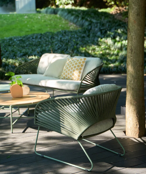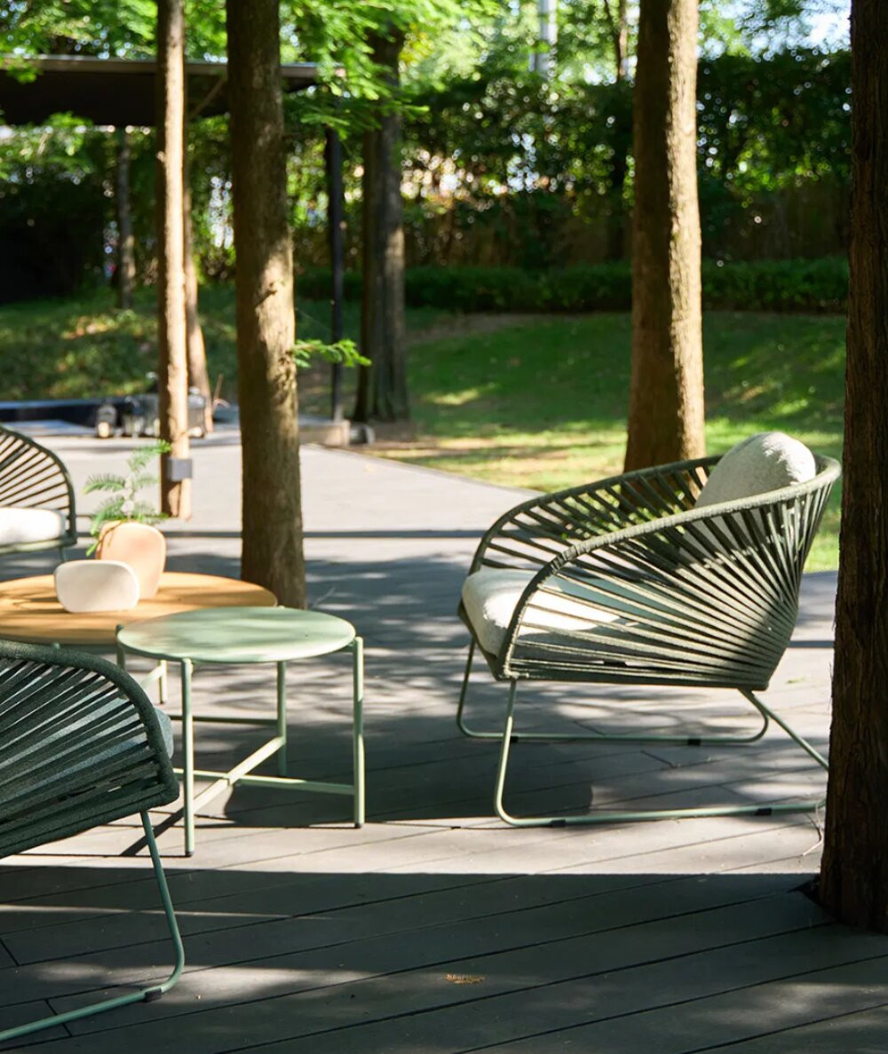 Det minimalistiske og stilfulde design skaber en let og luftig atmosfære, der passer perfekt til moderne uderum. De smukke, organiske former og de diskrete grønne nuancer giver et harmonisk look, der smelter naturligt sammen med udendørsmiljøet.