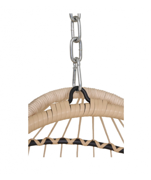 Denne hængestol er fremstillet i PE-rattan, som er kendt for sin slidstyrke og vejrbestandighed. Materialet kræver minimal vedligeholdelse og er modstandsdygtigt over for vind og vejr, hvilket gør stolen ideel til udendørs brug. Det sorte metalstativ giver stabilitet, mens den solide kæde sikrer en let og behagelig gyngebevægelse, der inviterer til afslapning.