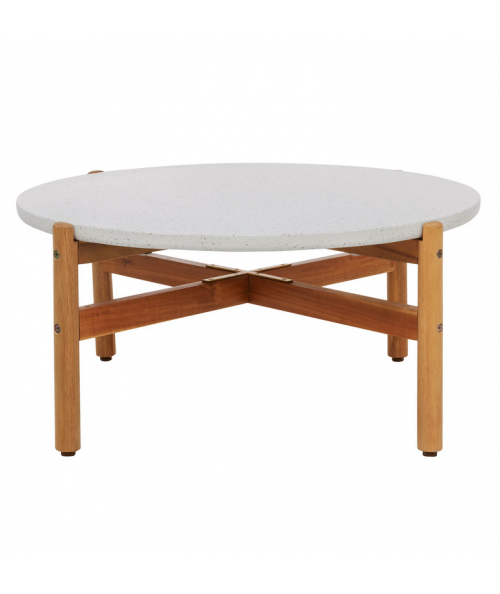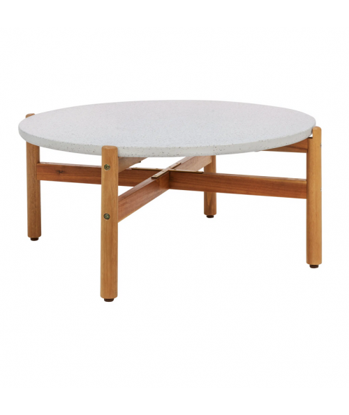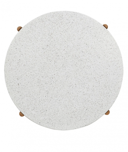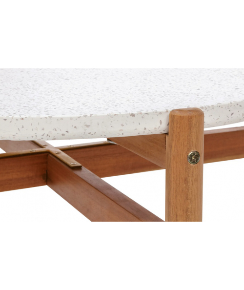 Med en diameter på 84,5 cm og en højde på 38,5 cm er bordet den perfekte størrelse til både stue, terrasse og loungeområde. Den hvide terrazzo-plade med naturlige stenfragmenter skaber et unikt spil af farver og teksturer, mens de varme træben i akacie tilfører en organisk og indbydende følelse.