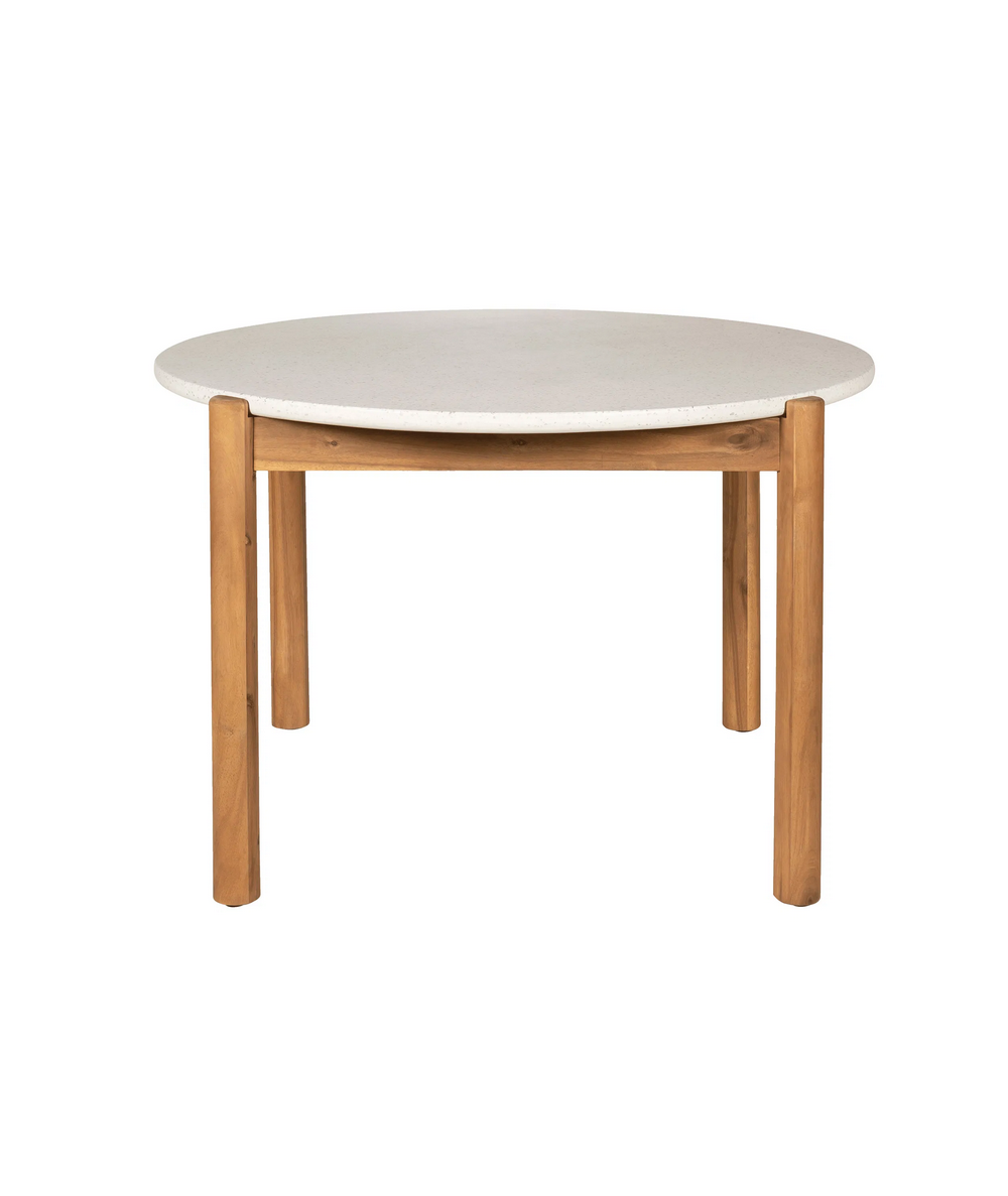 Det vejrbestandige acacietræ gør bordet ideelt til udendørs brug, og den hårdføre terrazzo-bordplade sikrer nem vedligeholdelse og en slidstærk overflade.