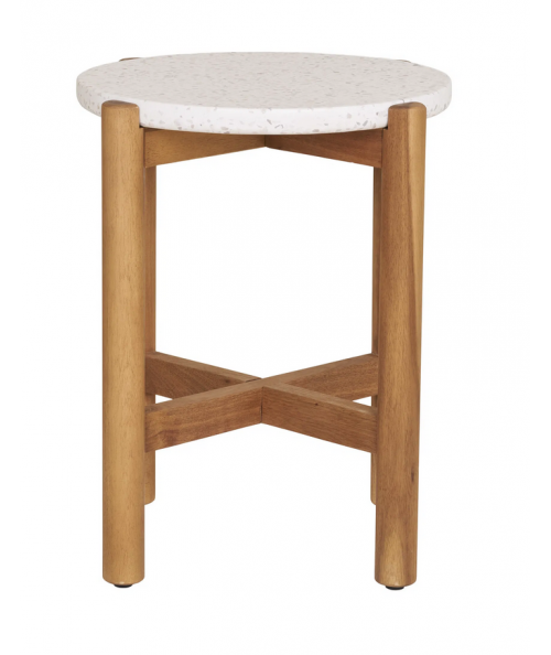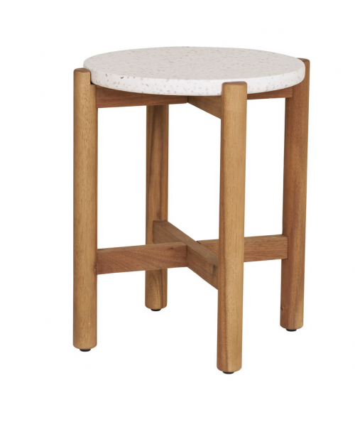 Terracina sidebordet er en perfekt kombination af tidløst design og naturlige materialer, der bringer elegance og funktionalitet ind i dit hjem eller udendørsområde. Med sin runde terrazzo-bordplade i smukke hvide nuancer og sit solide stel i varmt acacietræ skaber dette sidebord et eksklusivt og minimalistisk udtryk.