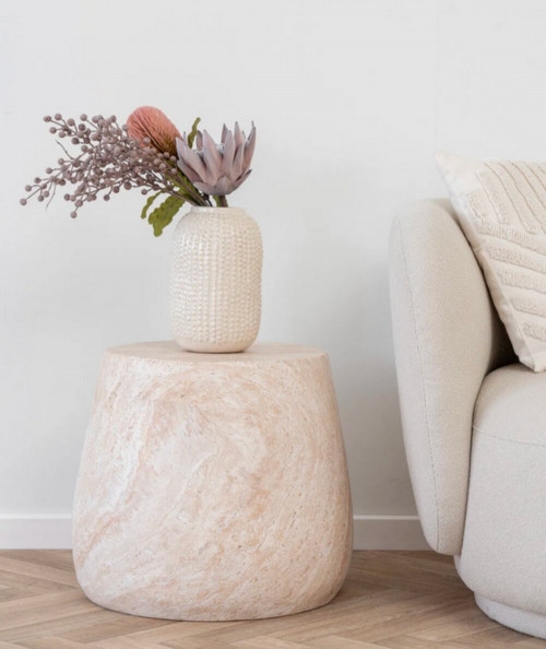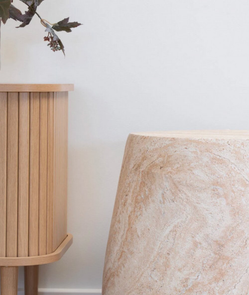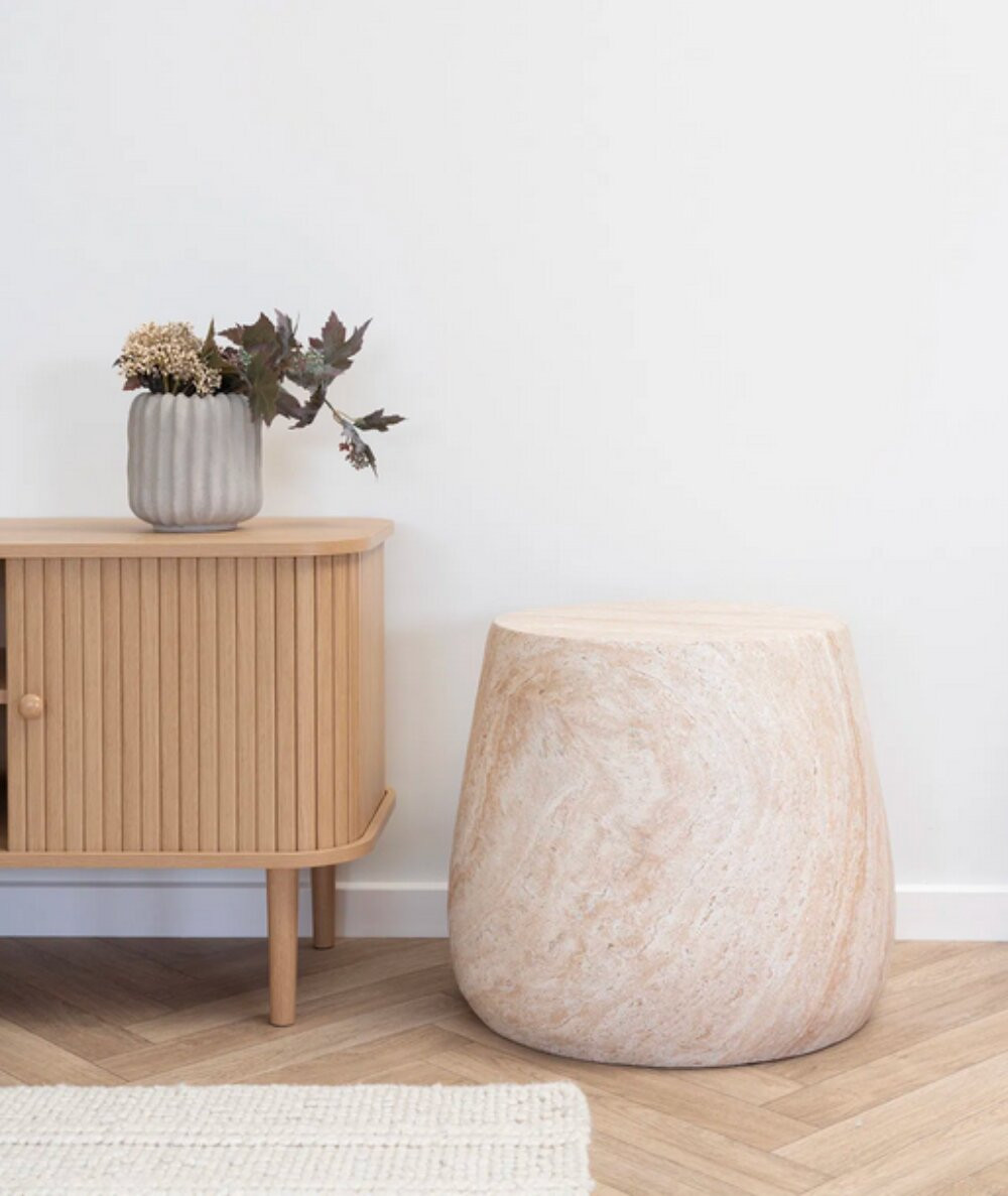 Bordets afrundede form og naturlige struktur giver det et tidløst og elegant udtryk. Det passer perfekt til en minimalistisk, skandinavisk eller boheme-inspireret indretning og tilfører varme og karakter til ethvert rum. Den neutrale farve gør det let at kombinere med andre møbler og farvetemaer.