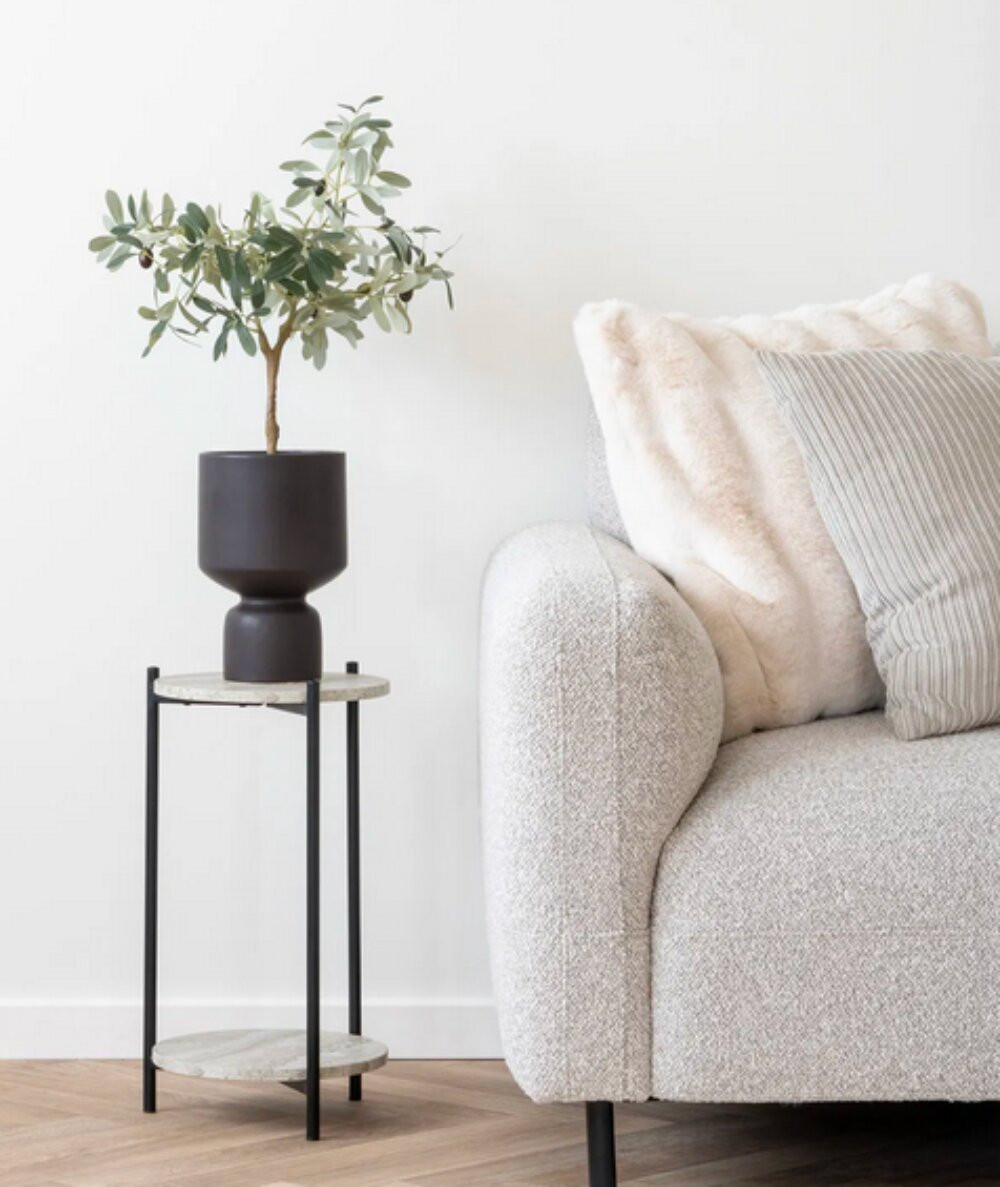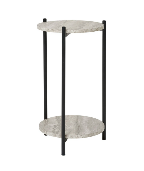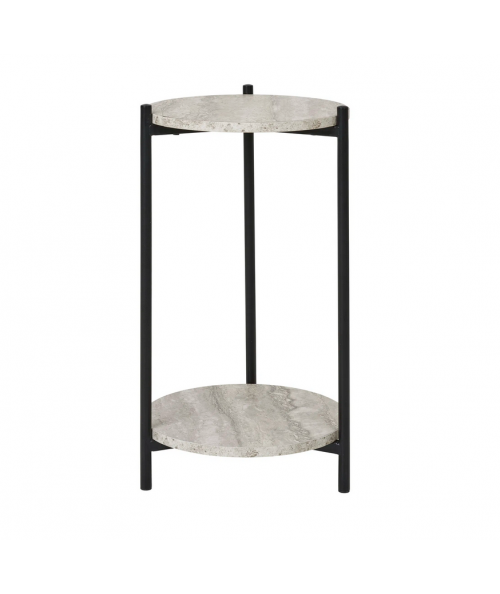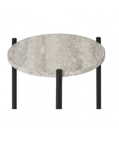Skab flot og elegant stemning Leuven sidebordet. Dette stilfulde bord har en bordplade og en hylde med travertin-look, der skaber en luksuriøs følelse uden den høje pris. De sorte ben i stål giver en flot kontrast og sikrer stabilitet, mens den kompakte størrelse på ø27x46 cm gør bordet ideelt til mindre rum eller som et diskret supplement til din sofagruppe.