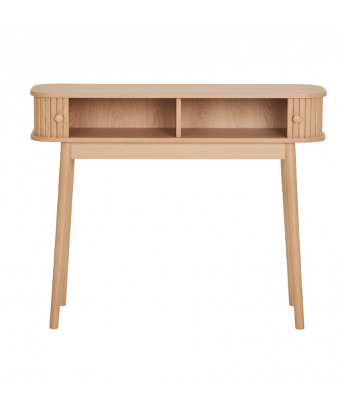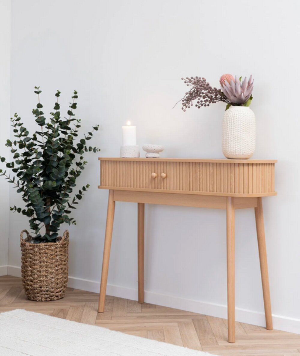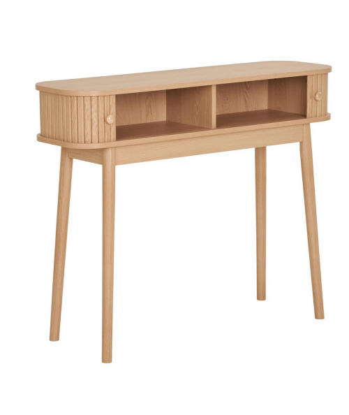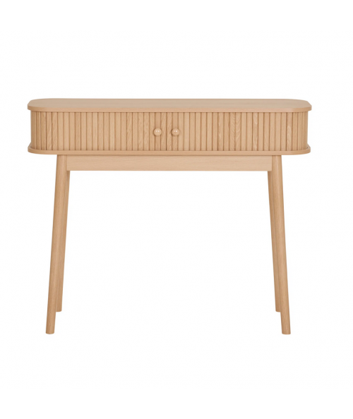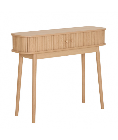 Med sine 100 cm i længden, 30 cm i bredden og en højde på 80,5 cm er dette konsolbord perfekt til entre, stue eller soveværelse. De to skuffer bag de riflede låger giver praktisk opbevaring til småting, mens bordpladen giver plads til dekorationer, lamper eller nøgler.