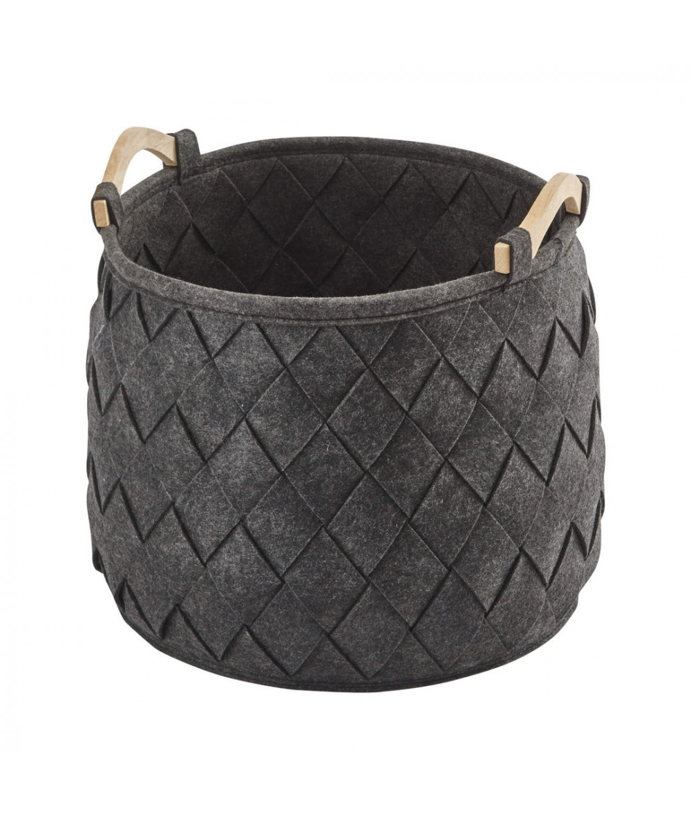 Den fine Amy opbevaringskurv har et robust design, og er lavet af 100 % polyesterfilt, som er 3 mm i tykkelse. Opbevaringskurven har en flettet struktur, hvilket giver et dekorativt udtryk. Det fine håndtag i træ tilføjer et nordisk udtryk, hvilket passer flot ind i den skandinaviske indretningsstil. Opbevaringskurven er en del af Amy serien. Der findes nemlig også en vasketøjskurv, så man kan kombinere disse to kurve, hvis man ønsker dette. Opbevaringskurven findes i denne fine mørkegrå men også i lysegrå farve.