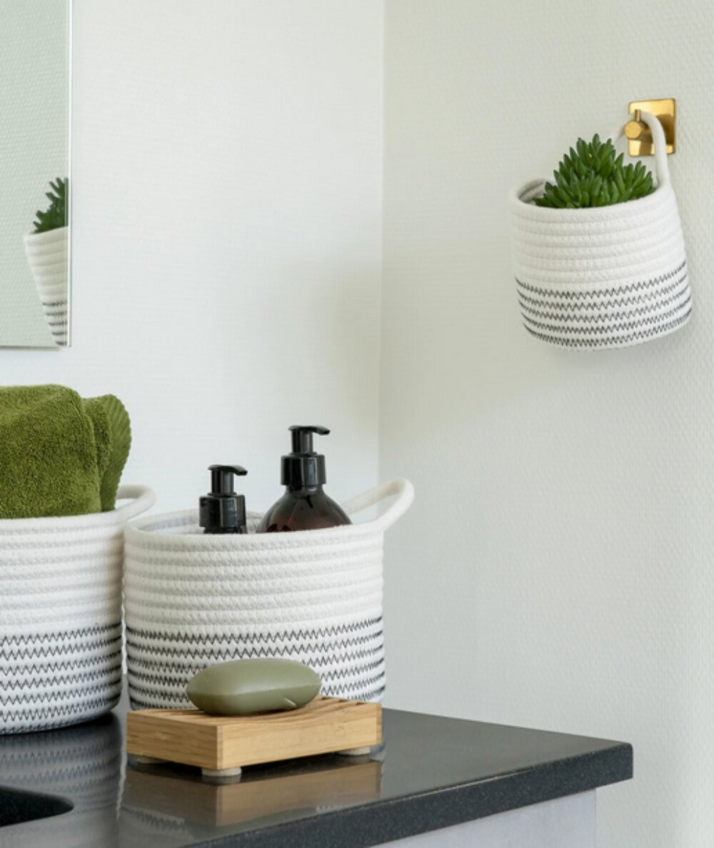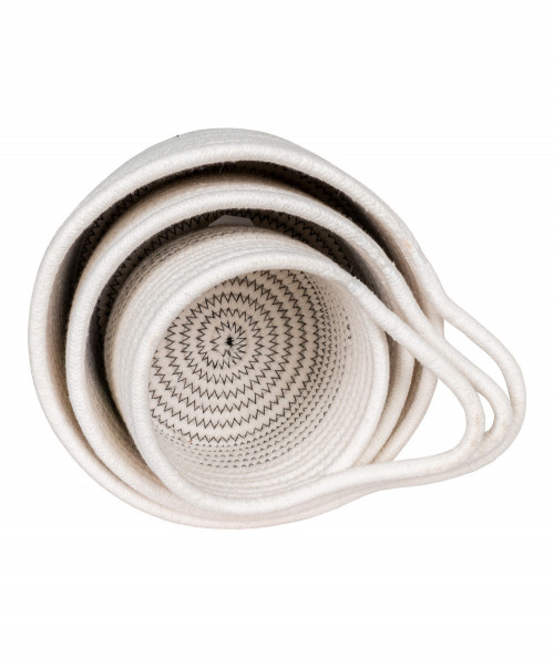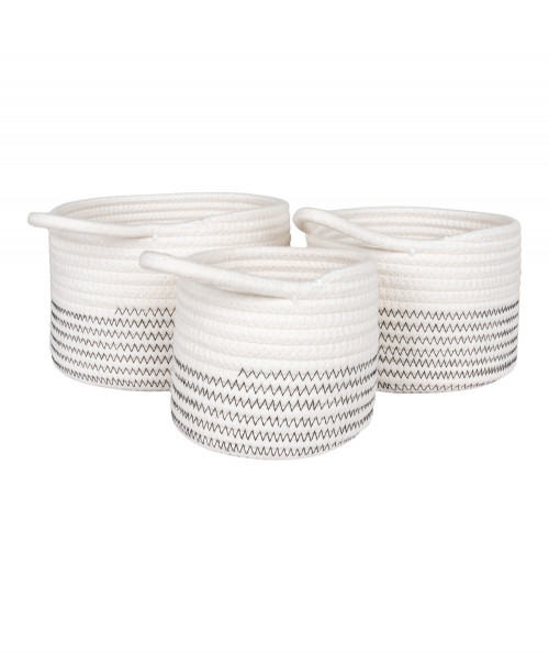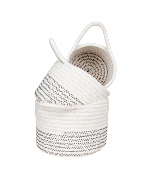 De praktiske Nadine kurve består af 3 stk i forskellige størrelser. Kurvene er lavet i bomuld i farven hvid/grå. Du kan bruge kurvene til forskelligt formål. Stil dem på badeværelset til håndklæder eller på børneværelset til legetøjet. Det er nogle fine kurve i neutrale farver, som passer ind til alle farver.