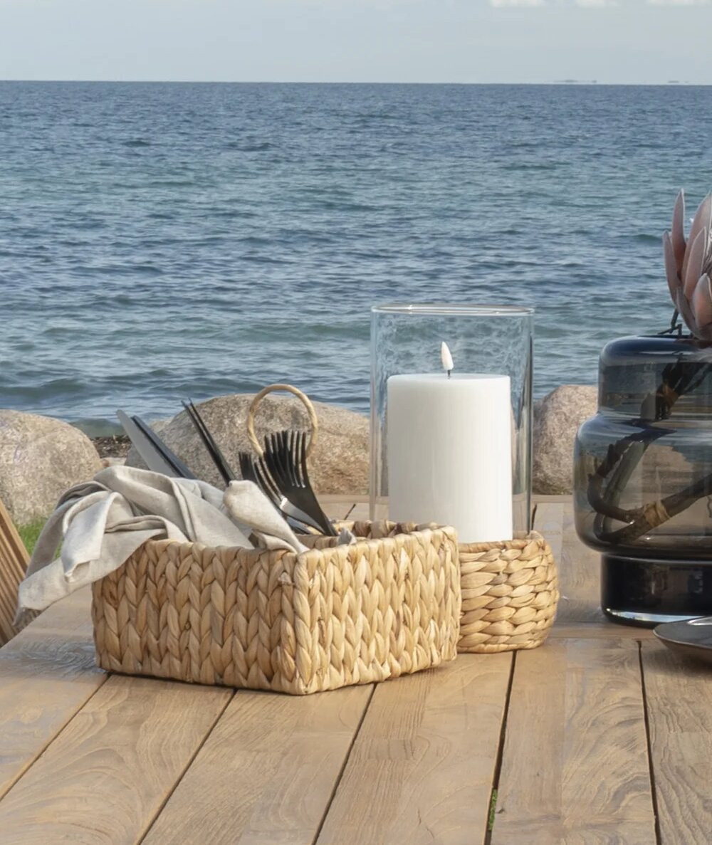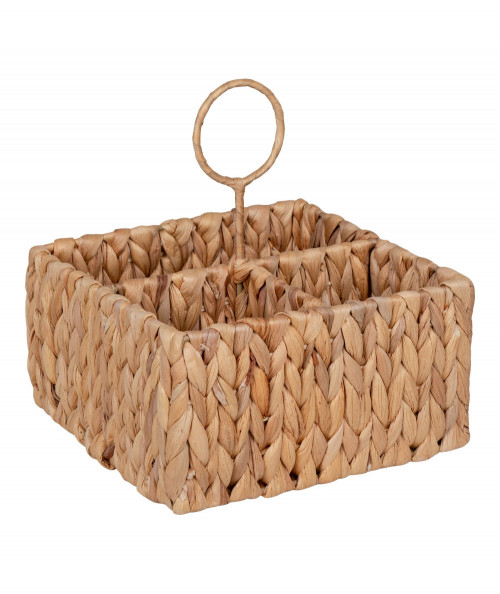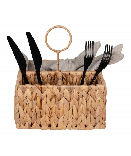 Kurvens kompakte størrelse og inddelte rum gør den ideel til opbevaring af bestik og servietter på spisebordet, som du kan se på billedet, hvor den tilfører en naturlig charme til borddækningen. Den er også oplagt til at holde styr på nøgler, fjernbetjeninger eller andre småting i stuen, køkkenet eller endda på terrassen.