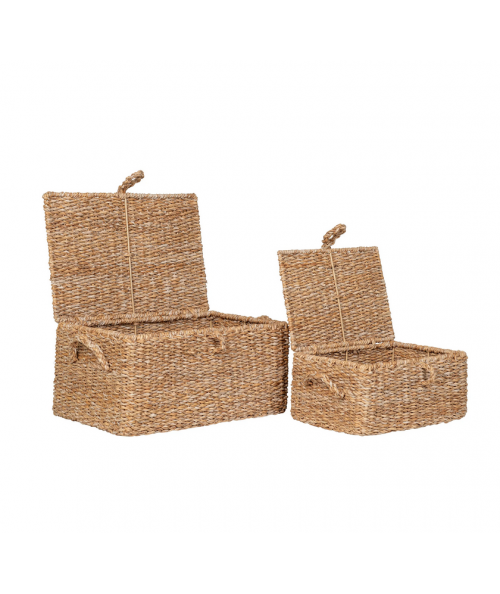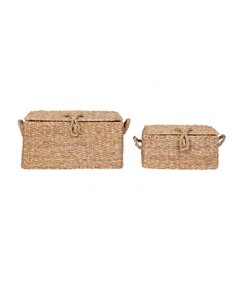 De flettede Bogra opbevaringskasser består af 2 stk og er lavet i naturligt søgræs og er den den perfekte løsning til at holde dit hjem organiseret og stilfuldt. De robuste kasser kommer som et sæt af to i forskellige størrelser og er ideelle til opbevaring af alt fra wellness produkter, gæste håndklæder, legetøj eller til picnic turen til stranden.