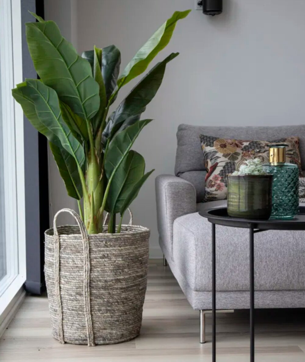 Den fine Udine Kurv er fra House Nordic. Kurven er rund og grå og passer flot ind i alle indretningsstile. Kurven er lavet ud af majs blade. Hyg evt. op med kunstige planter som vi også har på webshoppen.