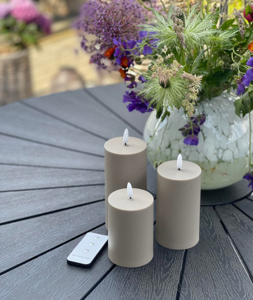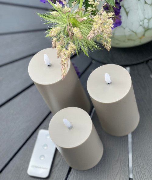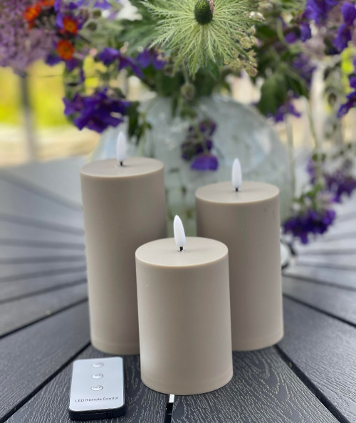 Skab hyggelig stemning udenfor med vores Flotte LED Bloklys i en flot sand farve. Det fine sæt består af 3 stk i forskellige størrelser og er beregnet til udendørsbrug. Til bloklysene medfølger fjernbetjening. Lysene er lavet i plastik, så de smelter ikke. Hyg op med lysene til hyggelige sammenkomster, sommerfester eller bare til hverdags brug.