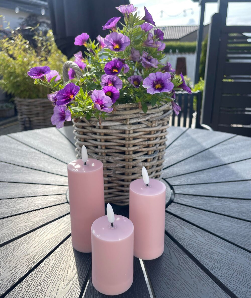 De fine LED bloklys sæt består af 3 stk. Bloklysene har en flot rosa farve og er beregnet til udendørs brug. Bloklysene skaber hyggelig stemning på terrassen. Stil dem sammen på bordet eller lad dem stå i en dekoration med blomster. Til bloklysene medfølger der en fjernbetjening og lysene er lavet i plast, så de ikke smelter i solen. Lad bloklysene hygge op til hyggelige sammenkomster, sommerfester eller bare til hverdags brug.