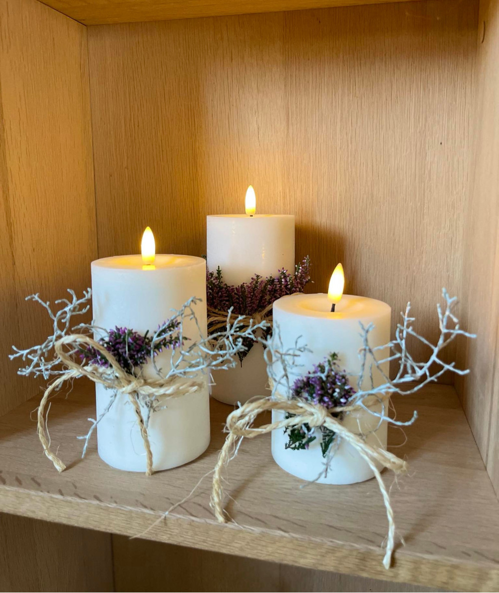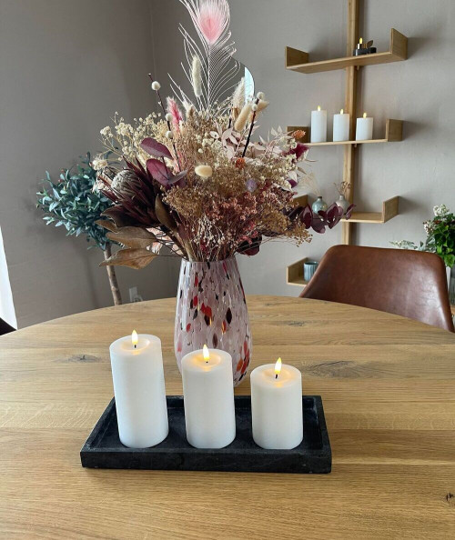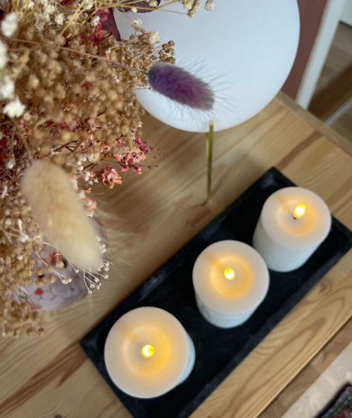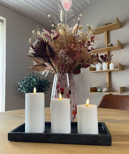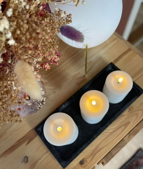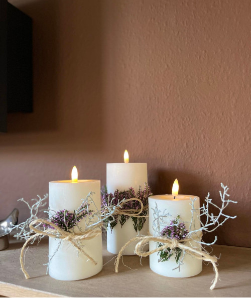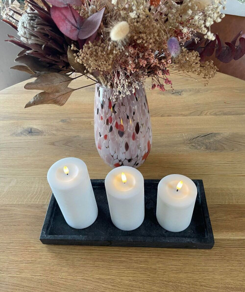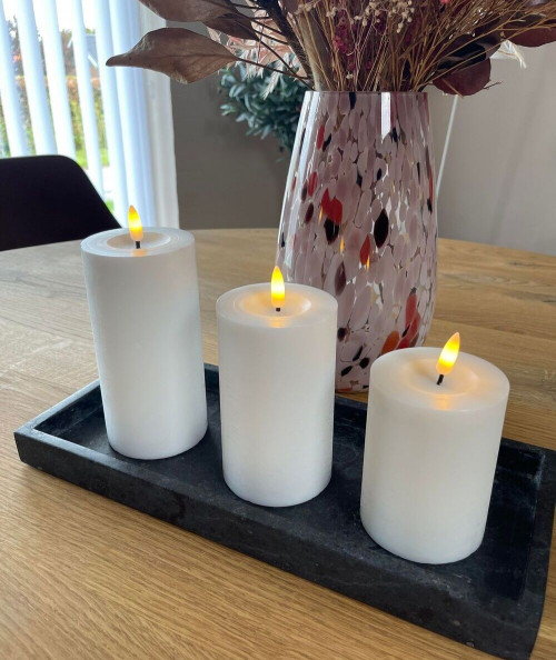 Et virkelig flot bloklys sæt i hvid paraffin look. Sættet består af 3 bloklys inkl. fjernbetjening. Bloklysene betjenes via den medfølgende fjernbetjening, hvor du kan tænde og slukke. Derudover er der en timer funktion, som du kan aktivere via fjernbetjeningen. Når timer funktionen er slået til, så vil bloklysene selv slukke efter 6 timer. Flammen på bloklysene virker utrolig realistisk, da den bevæger sig ligesom et levene lys. De giver en varm og behagelig glød til rummet. Bloklysene er belagt med paraffin, som er med til at give fornemmelsen af rigtige stearinlys.