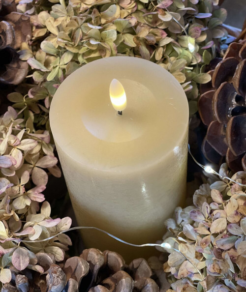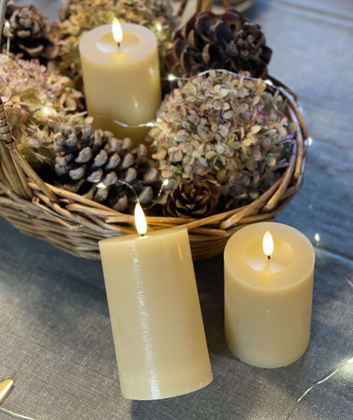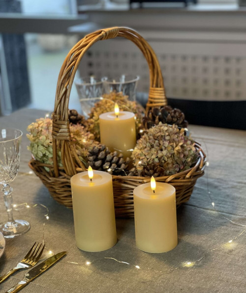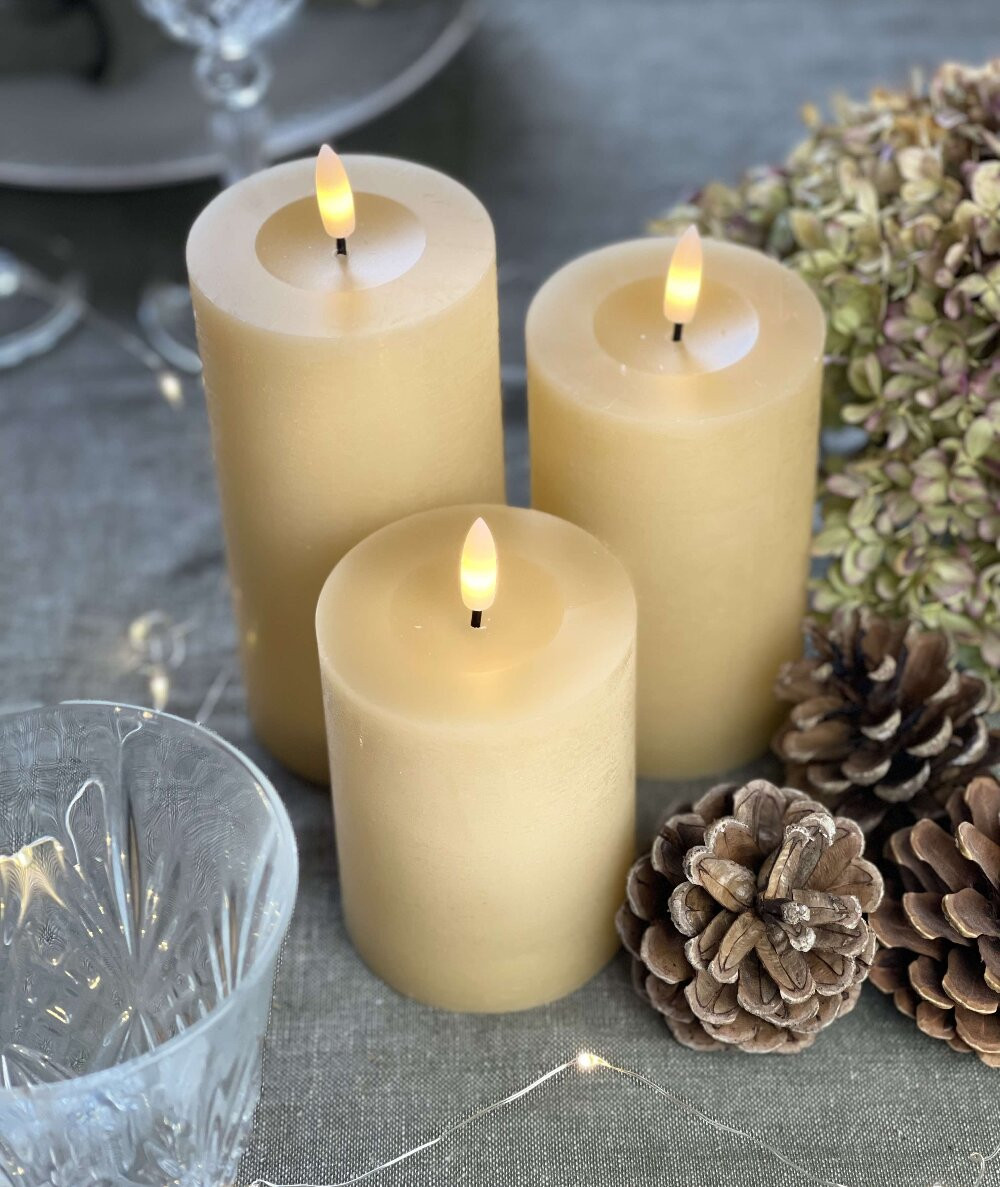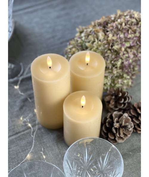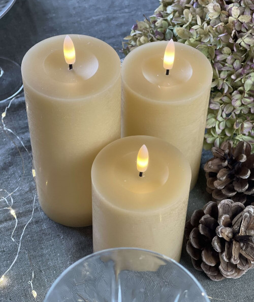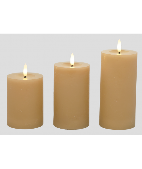 Et virkelig flot bloklys sæt i en mørk amber farvet paraffin look. Sættet består af 3 bloklys inkl. fjernbetjening. Bloklysene betjenes via den medfølgende fjernbetjening, hvor du kan tænde og slukke. Derudover er der en timer funktion, som du kan aktivere via fjernbetjeningen. Når timer funktionen er slået til, så vil bloklysene selv slukke efter 6 timer. Flammen på bloklysene virker utrolig realistisk, da den bevæger sig ligesom et levene lys. De giver en varm og behagelig glød til rummet. Bloklysene er belagt med paraffin, som er med til at give fornemmelsen af rigtige stearinlys.