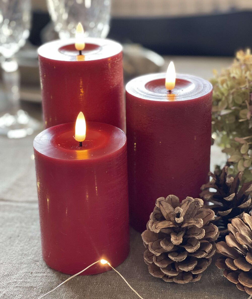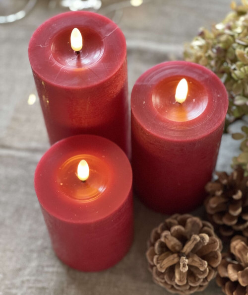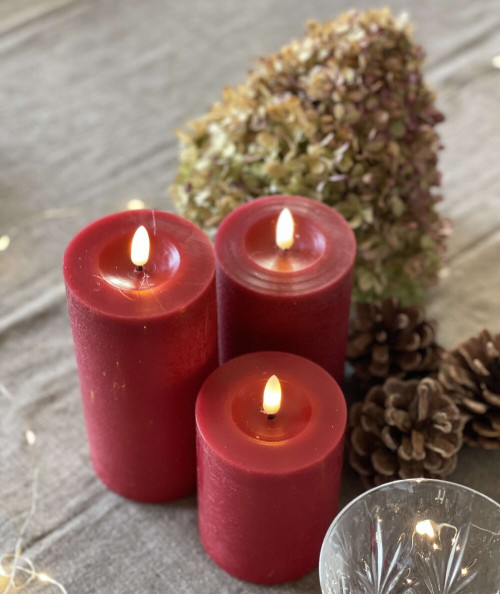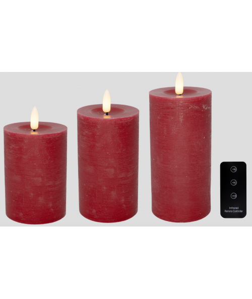 Et virkelig flot bloklys sæt i mørkerød paraffin look. Sættet består af 3 bloklys inkl. fjernbetjening. Bloklysene betjenes via den medfølgende fjernbetjening, hvor du kan tænde og slukke. Derudover er der en timer funktion, som du kan aktivere via fjernbetjeningen. Når timer funktionen er slået til, så vil bloklysene selv slukke efter 6 timer. Flammen på bloklysene virker utrolig realistisk, da den bevæger sig ligesom et levene lys. De giver en varm og behagelig glød til rummet. Bloklysene er belagt med paraffin, som er med til at give fornemmelsen af rigtige stearinlys.