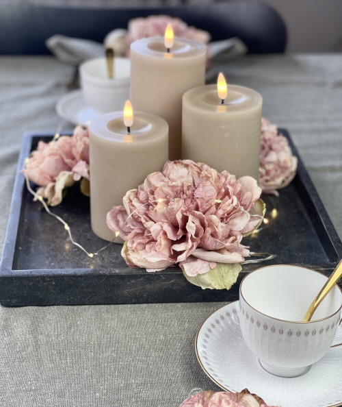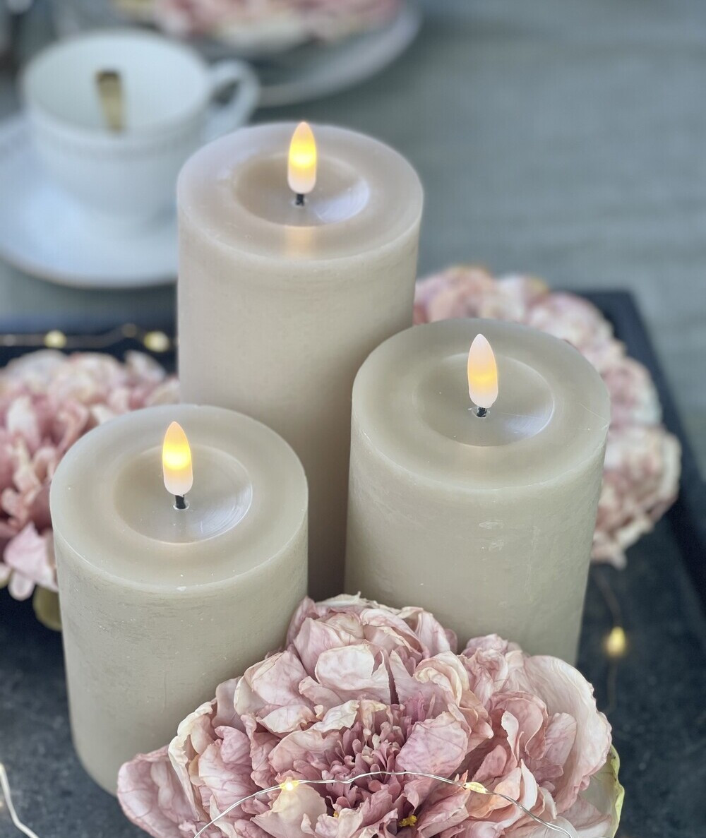 Et virkelig flot bloklys sæt i sand farvet paraffin look. Sættet består af 3 bloklys inkl. fjernbetjening. Bloklysene betjenes via den medfølgende fjernbetjening, hvor du kan tænde og slukke. Derudover er der en timer funktion, som du kan aktivere via fjernbetjeningen. Når timer funktionen er slået til, så vil bloklysene selv slukke efter 6 timer. Flammen på bloklysene virker utrolig realistisk, da den bevæger sig ligesom et levene lys. De giver en varm og behagelig glød til rummet. Bloklysene er belagt med paraffin, som er med til at give fornemmelsen af rigtige stearinlys.