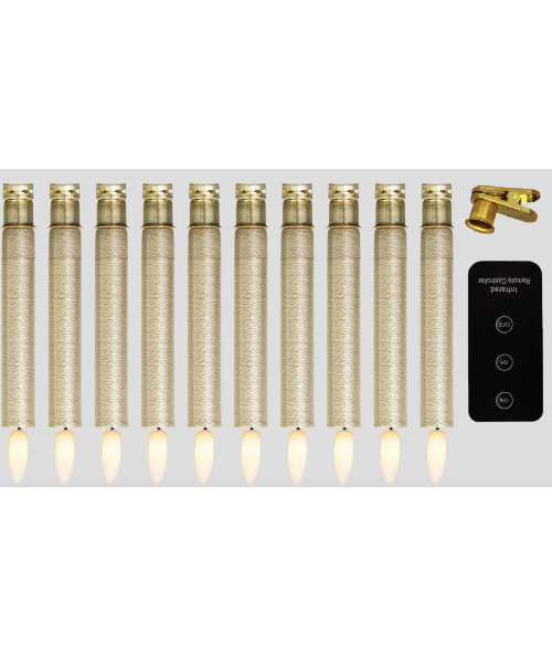 Disse smukke juletræslys kommer i en pakke med 10 stk. og er udført i en elegant guldfinish, der vil give dit juletræ et eksklusivt og festligt udtryk. Hvert lys er forsynet med en praktisk holder, så de nemt kan fastgøres på grenene, og takket være den medfølgende fjernbetjening kan du let tænde og slukke lysene, samt benytte timer-funktionen. Den bløde, varme LED-flamme skaber en hyggelig og sikker belysning, hvilket gør dem ideelle til familier med børn og kæledyr.
