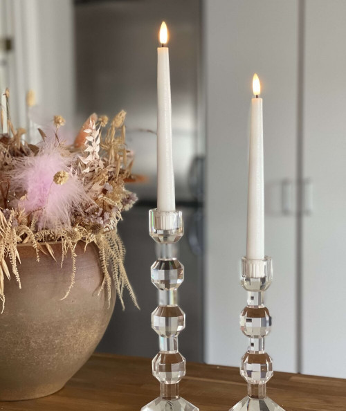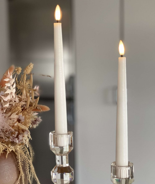 2 Flotte Koniske LED lys i målene Ø2,2 x H24,5 cm. Lysene skaber en beroligende og elegant atmosfære i hjemmet. De smukke lys er beklædt med paraffin, så de er meget naturtro. Lysene er ikke kun æstetisk tiltalende men også funktionelle. Du skal ikke være bange for at de brænder ned, men kan tænde og slukke for lysene, som det passer dig med evt. fjernbetjening som kan tilkøbes. Dæk et smuk bord med de smukke lys og skab hyggelig, varm og romantisk stemning. Lysene har 3d flamme, som giver et naturligt flakkende look.
