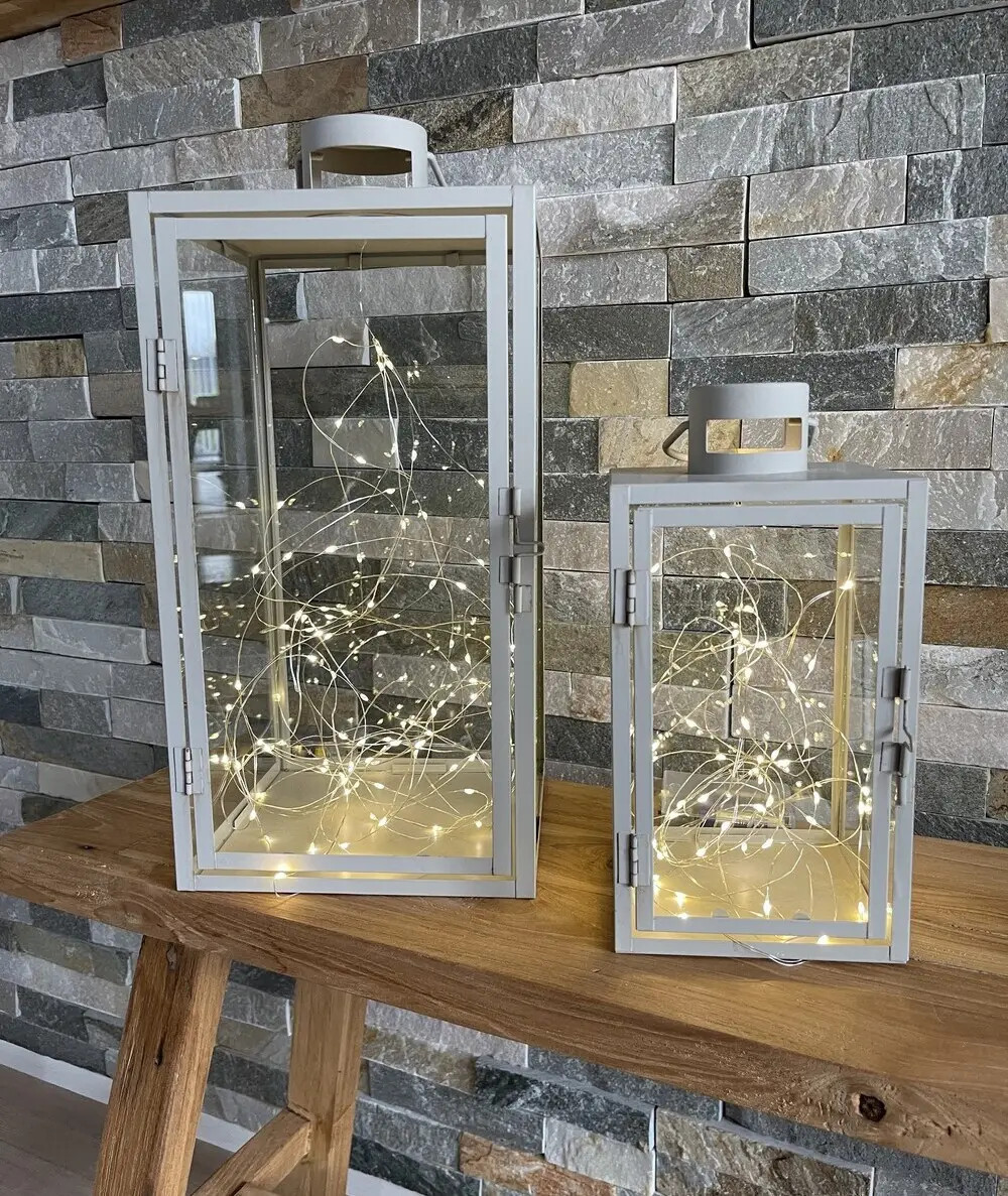 På billederne bruger vi lyskæden i Corfu lanternesættet, som findes i grå og grøn. Se vores lanterner her