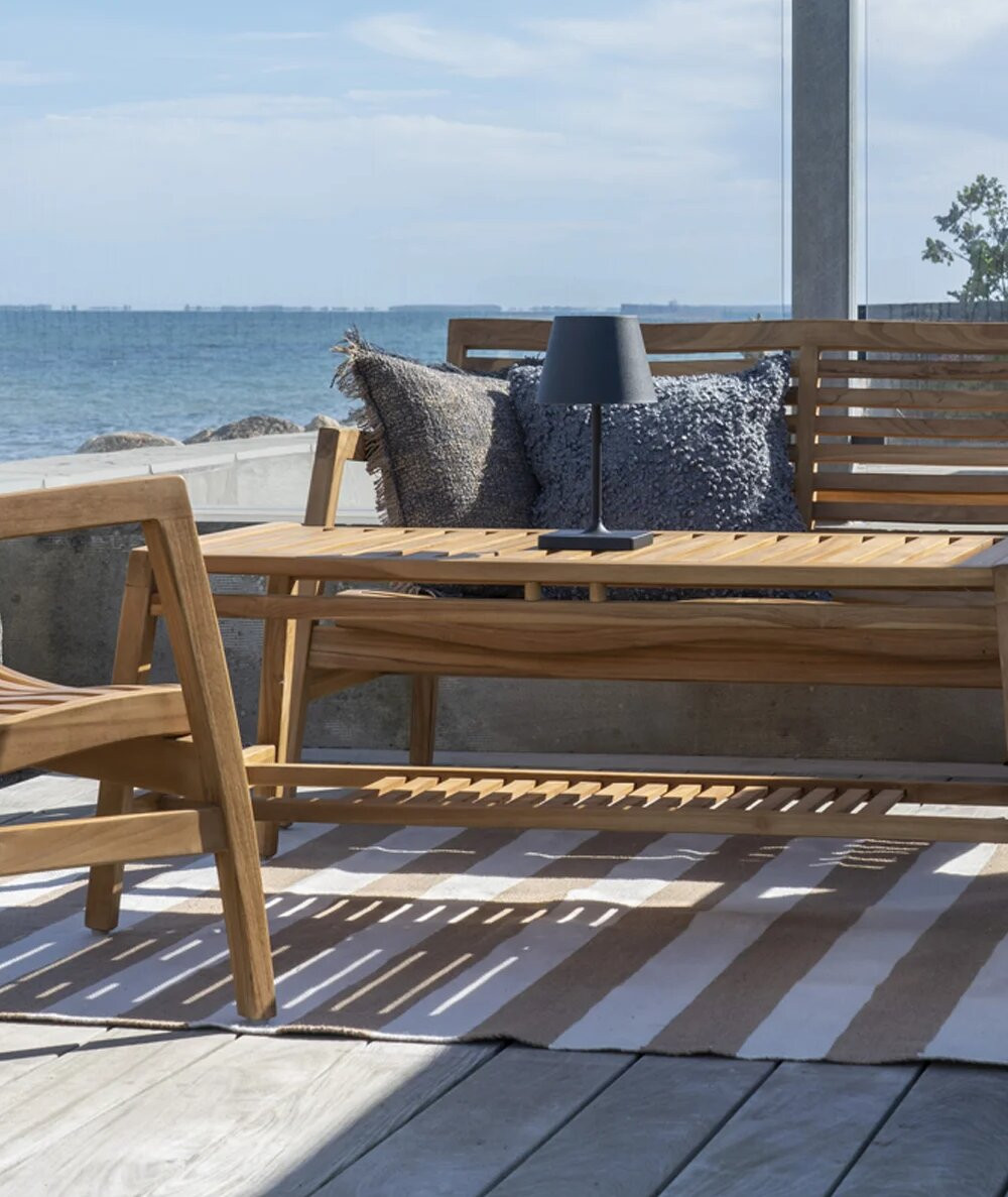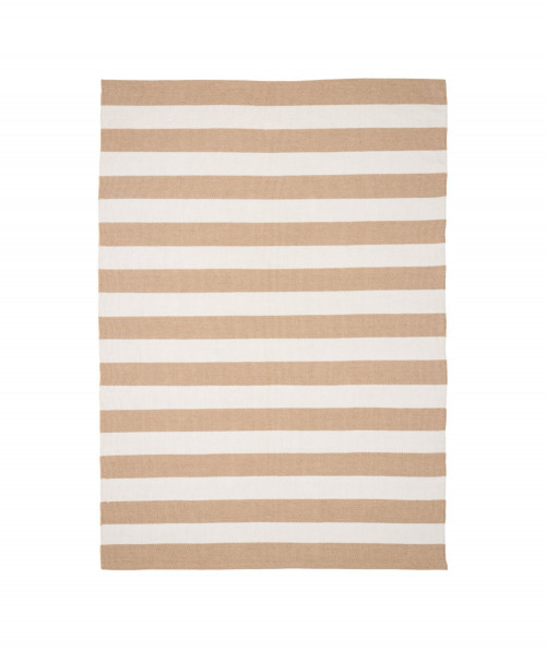 Flot løst tæppe til udendørs brug. Tæppet er lavet i 100% genanvendt plast og hygger op på terrassen. Farverne på tæppet er beige og off white og det måler 200x300 cm. Skab små oaser med løse tæpper. Det er med til, at skabe hyggelig stemning i uderummet.
