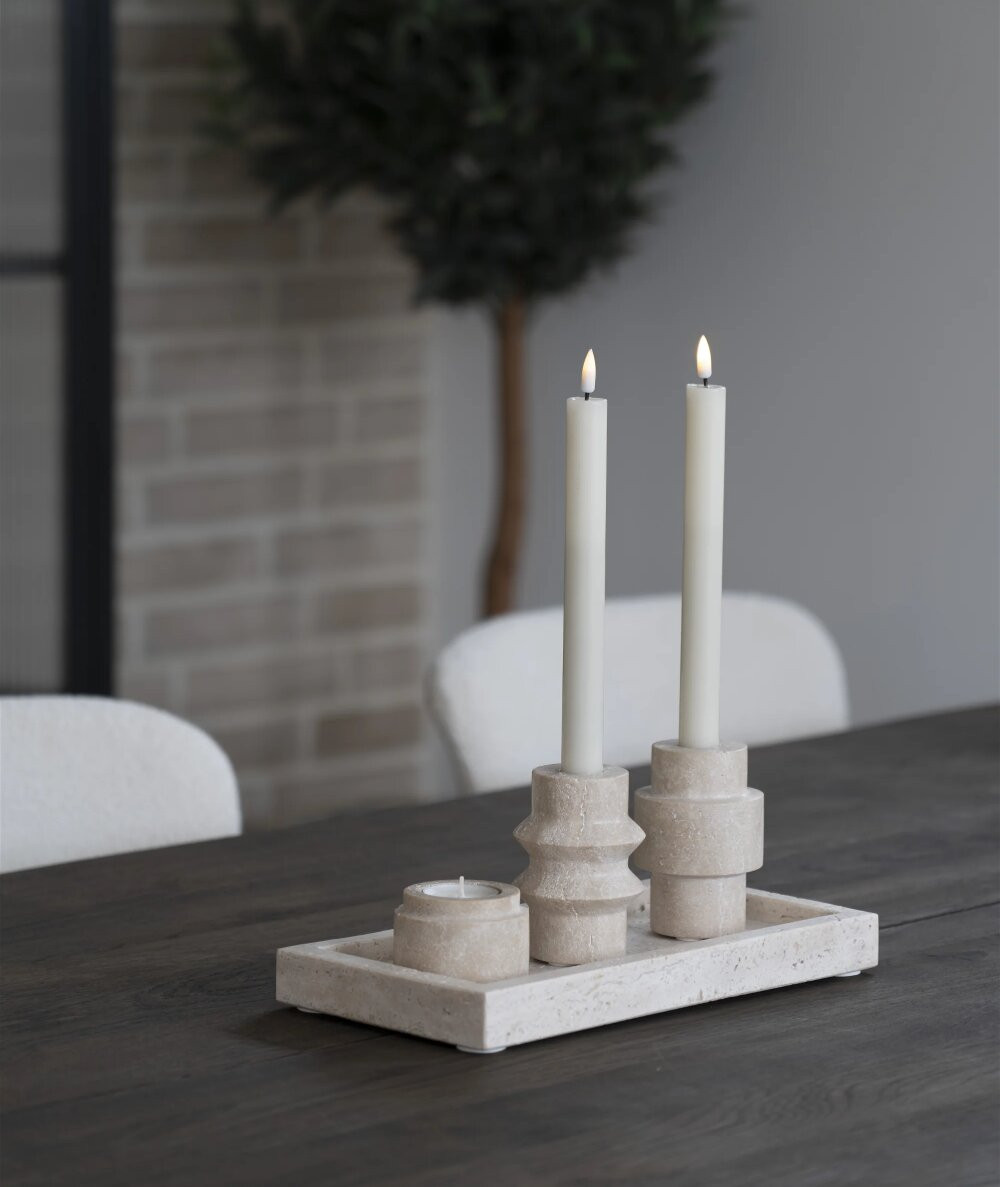 De fine fyrfadsstager består af to stk og de har et elegant og flot udtryk. Fyrfadsstagerne er lavet i Travertin, som er en natur sten. De smukke fyrfadsstager passer sammen med vores fine lysestager, som også har samme farve og lavet i den samme sten sort. Se her. Fyrfadsstagens mønstre kan variere, da de er lavet i natur sten, hvilket giver et unikt look. Tilføj de fine fyrfadsstager i kurven og lad dem sprede hyggelig stemning hos dig.