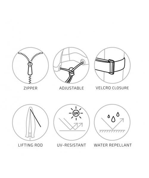 Overtrækket har en lynlås, velcrolukning og en justerbar snor, hvilket gør det nemt at montere og sikre, at det sidder tæt omkring parasollen. Derudover medfølger en løftestang, så du let kan placere overtrækket uden besvær.