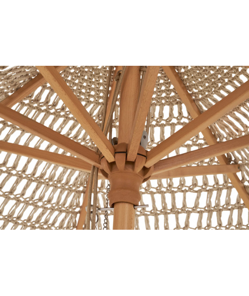 Denne parasol er fremstillet med et stel i massivt bøgetræ, som sikrer både stabilitet og en naturlig æstetik. Den håndhæklede dug i bomuld giver et unikt udtryk og en let og luftig skygge, samtidig med at den tilfører en luksuriøs følelse til din udendørsindretning. Den elegante frynsekant tilføjer et kunstnerisk præg og understreger parasollens boheme-stil, som passer perfekt til sommerens afslappede dage i haven eller ved poolen.