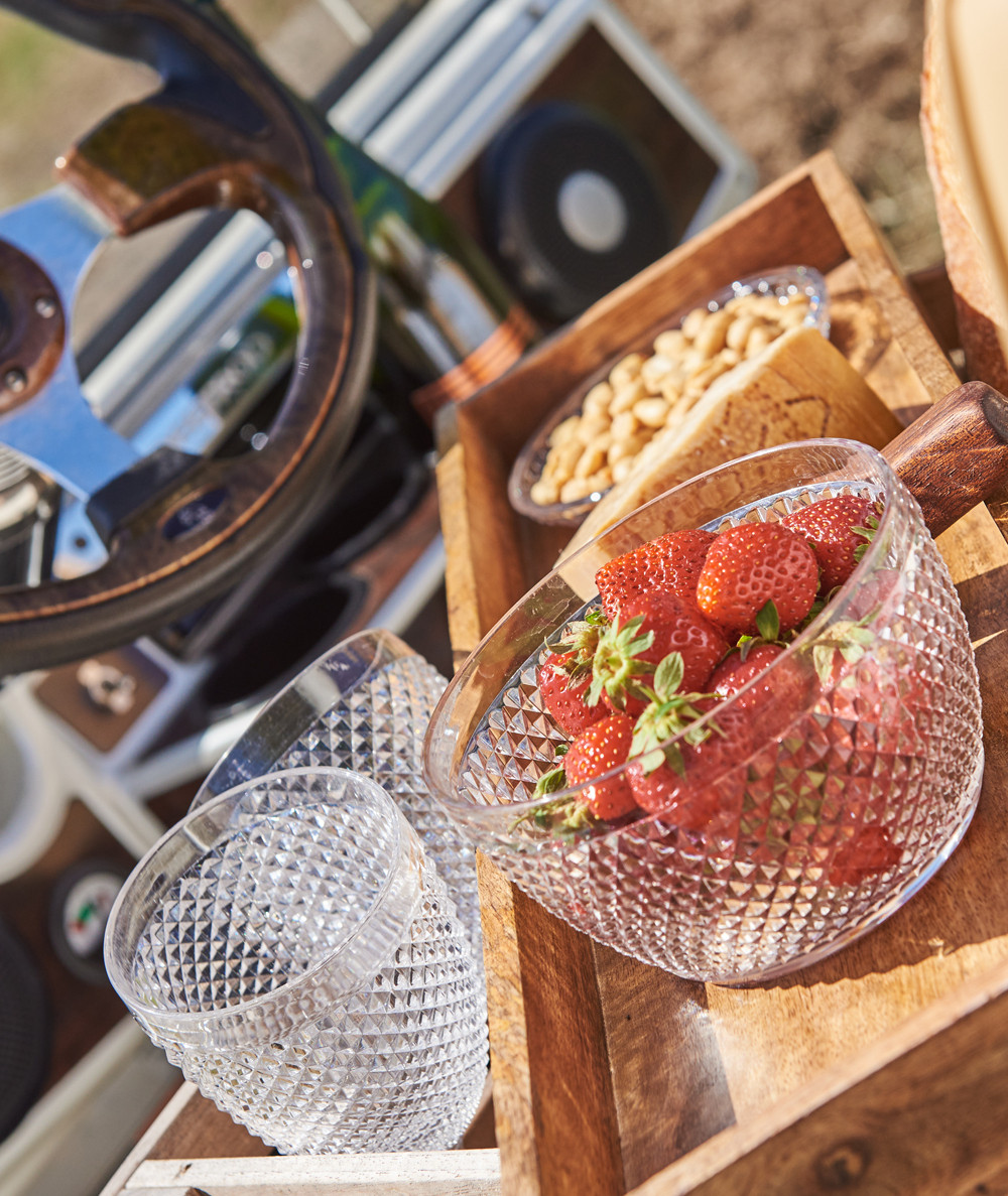 Skålen er oplagt til hjemmet men også til camping, da den ikke vejer særlig meget. Den er perfekt til servering af snacks, opbevaring af små genstande eller kan bruges til en sød lille dekoration. Det gennemsigtige design gør den også ideel til visning af farverige frugter eller blomsterarrangementer, hvilket giver en kreativ touch til ethvert rum.