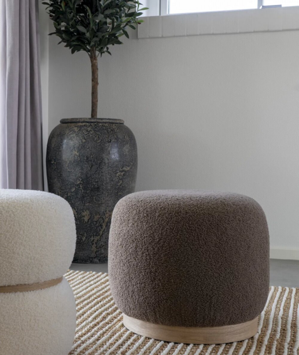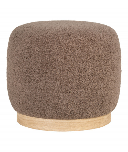 En smart Geneviève puf i brun bouclé med en træ kant i bunden. Puffens farve står flot i kontrast til den fine træ detalje. Puffen har et flot design, måler L44,5 x H40 x B44,5 cm og er lavet i 100% Polyester og træ. Puffen passer flot ind i den nordiske indretningsstil, hvor træ oftest er implementeret.