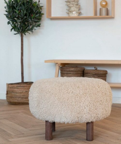Puffens yderstof er lavet af 100% polyester, hvilket giver den en blød og indbydende overflade. Den er polstret med skum for ekstra komfort, mens dens indre struktur af krydsfiner og fyrretræ sikrer holdbarhed og stabilitet. Puffens runde, bløde former og de elegante træben tilføjer et organisk og hyggeligt udtryk, der vil skabe en varm atmosfære i ethvert rum.