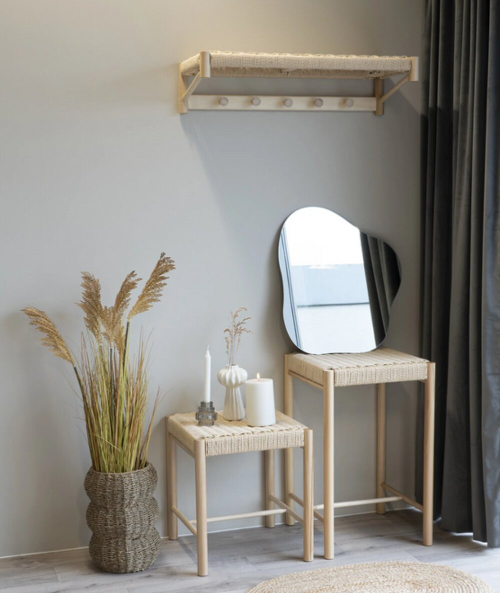 Den fine Bibi hattehylde er lavet i poppel og har en flethylde. Hattehylden passer sammen med den flotte Bibi taburet og står smukt sammen. Lav evt. et stilleben med taburet, spejl og en kurv med en flot tørret buket i. Hattehylden måler 78x31 cm.