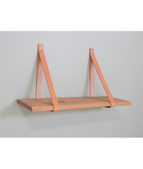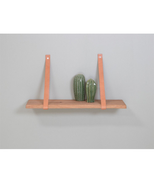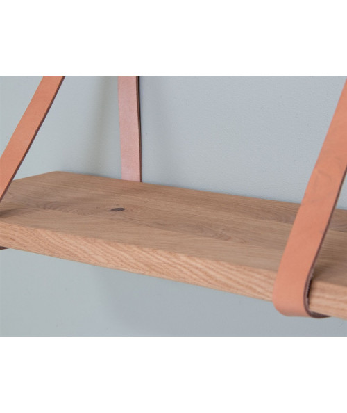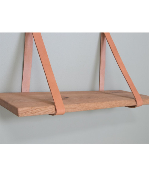 Hylden er natur olieret og kan hænges op med læderstropper, som sælges separat. Vi har 2 varianter af læderstropperne i hhv. sort og natur. Udseendet på hylden kan variere, da der tale om rigtig træ.