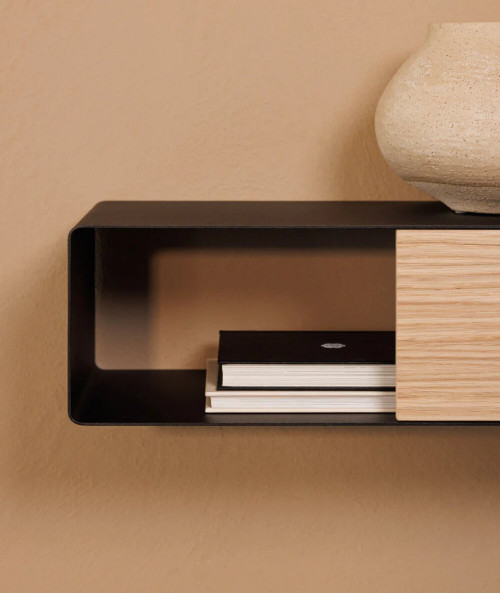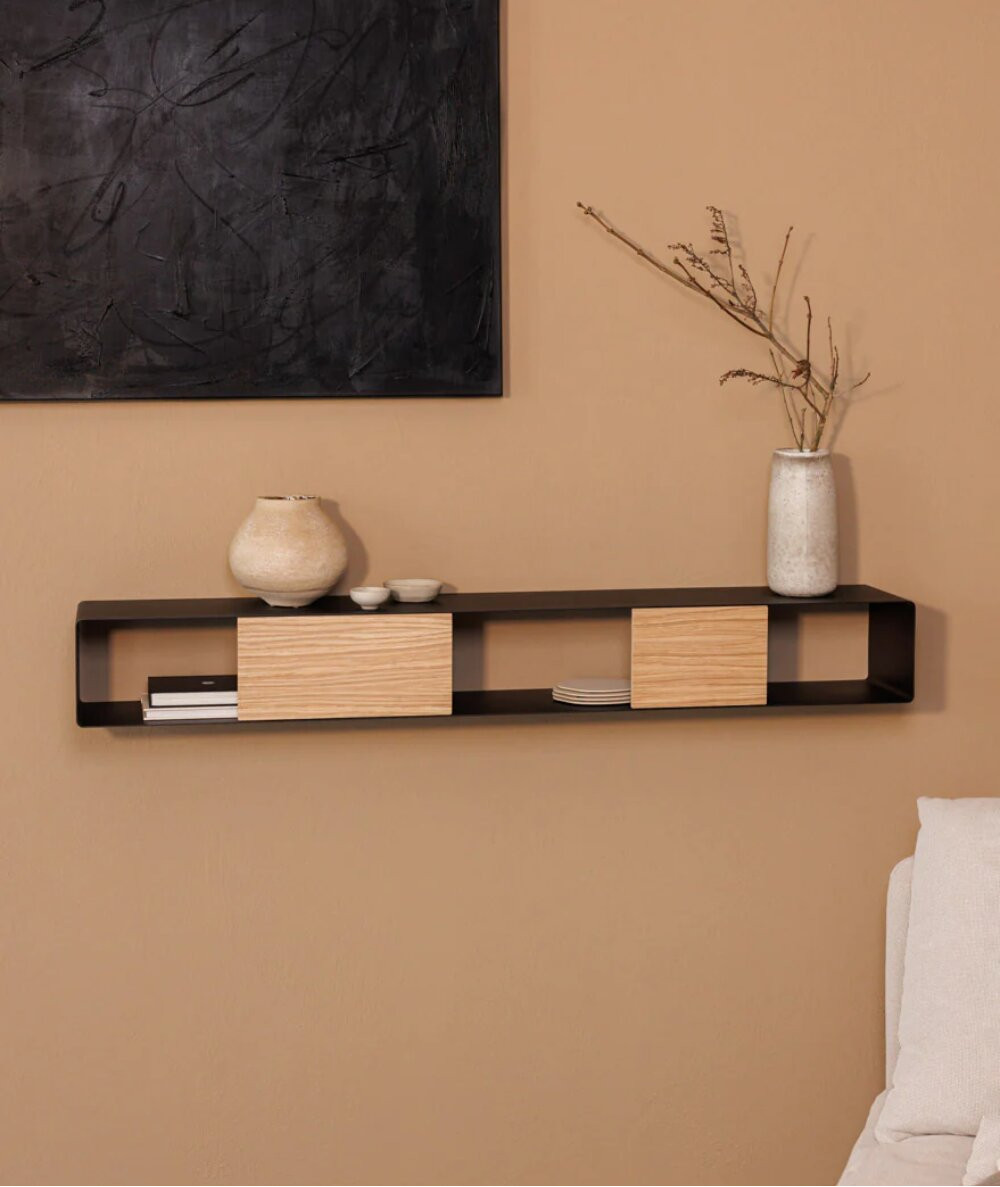 SION hylde er designet af designeren Bärbel Franz og beviser, at skønhed ofte findes i enkelhed. Dens bevidste enkelhed gør det til et tidløst, iøjnefaldende møbel i ethvert rum. Det delikat udformede metal og minimal brug af træ giver SION et elegant udtryk. Det flotte møbel er et mesterstykke i din indretning, der tilbyder perfekt balance mellem stil og funktionalitet. Hylden er lavet i et kombineret metaldesign og egetræs detaljer, som er naturligt olieret. Det smukke møbel tilføjer en subtil elegance til alle rum i hjemmet. Dens stilfulde design giver et smukt udtryk til hjemmet og det er designet sådan at man ikke ser synlige skruer. Der medfølger en kabelholder til din smartphone.