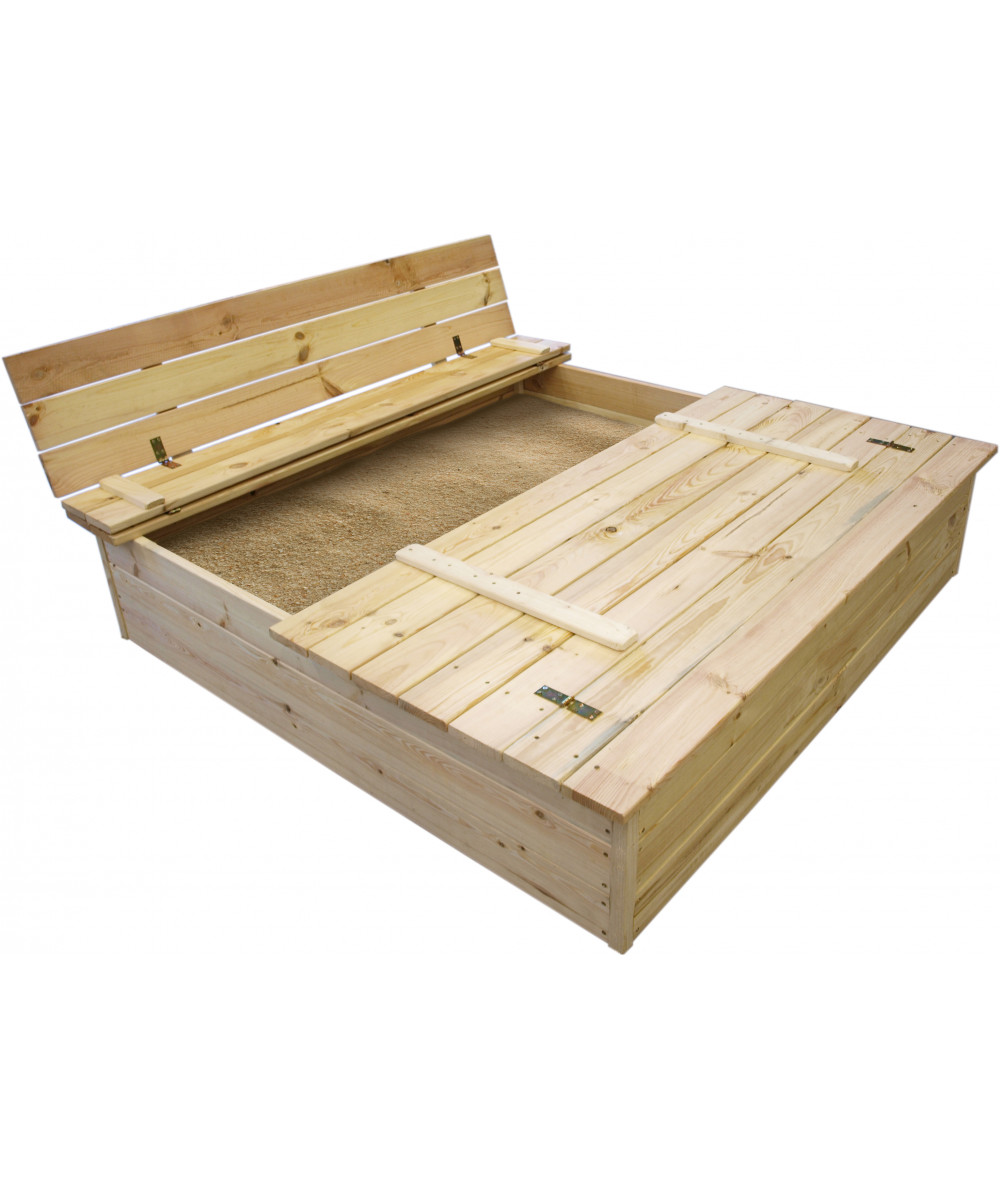 Låget på denne sandkasse bliver til en smart bænk, når det slås op. Låget er heldækkende og giver optimal beskyttelse af både legetøj og sand. Med størrelsen 140x140 cm er der nu plads til endnu flere børn. Sandkassen bør efterbehandles med træbeskyttelse med eller uden farve. Sandkassen er i ubehandlet grantræ.