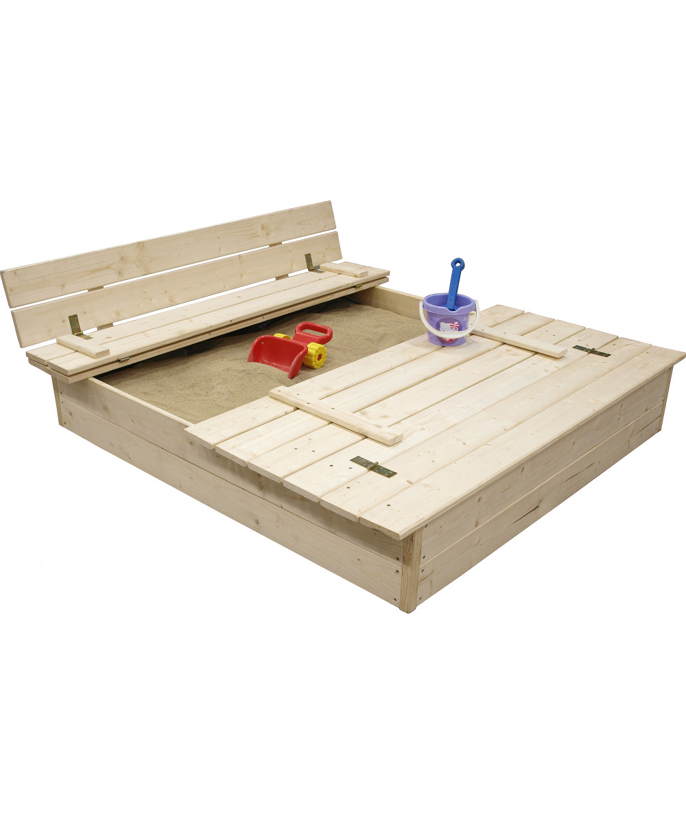 Denne sandkasse er praktisk på den måde at låget på sandkassen bliver til en smart bænk, når det slås op. Låget dækker hele sandkassen og giver en optimal beskyttelse af både legetøj og sand. Den fine sandkasse bør efterbehandles med træbeskyttelse.