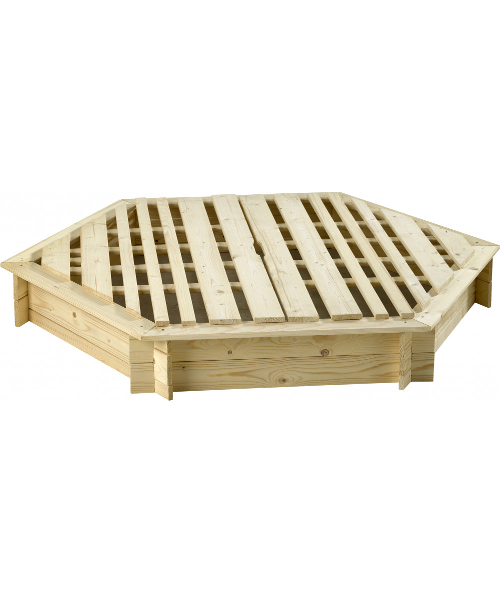 Sekskantet sandkasse med siddebrædt og låg. Dette er den største sandkasse vi har og her er masser af plads. Her kan sidde flere børn på samme tid. Det er en god ide at efterbehandle sandkassen med træbeskyttelse med eller uden farve. Sandkassen er nemlig i ubehandlet grantræ.