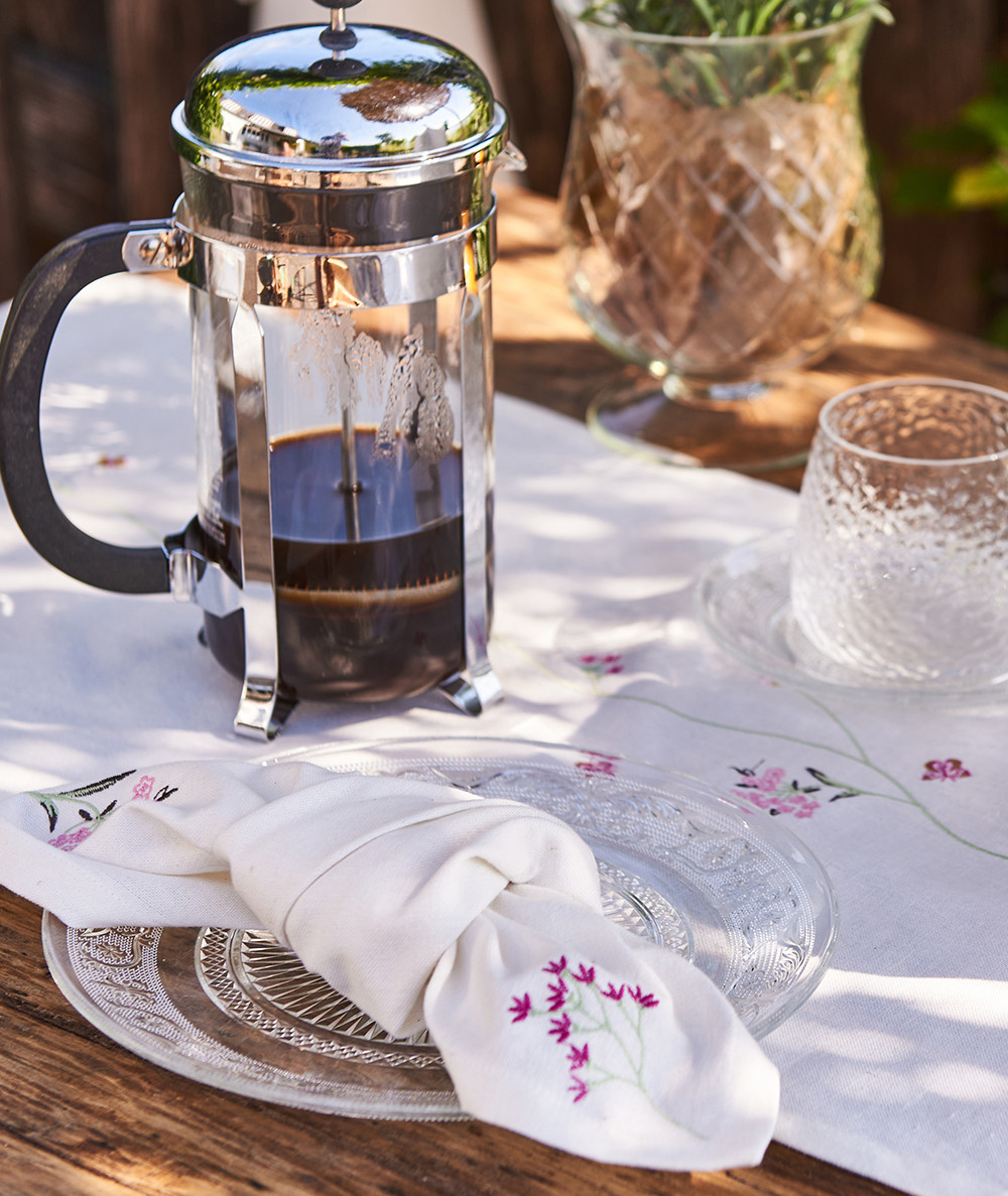 De fine servietter er omhyggeligt broderet med fokus på detaljer, hvilket skaber en unik tekstur og et hyggeligt design. De er lavet i bomuld og hør, hvilket giver dem et luftligt og behageligt udtryk at se på men også at røre ved. Servietterne er holdbare til at modstå hyppig brug og vask og er en kombination af elegance og holdbarhed, der vil gøre din borddækning smuk og yndefuld.