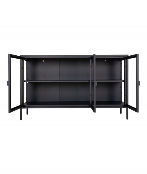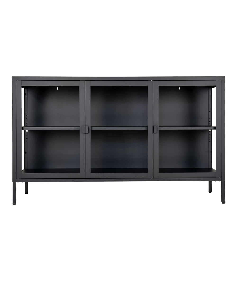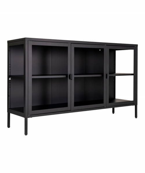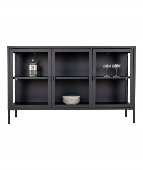 Den flotte Brisbane skænk har et robust og eksklusivt udtryk. Skænken er i mat sort metal, hvilket giver skænken et flot finish. Skænken har glaslåger også i siderne samt jernhylder til opbevaring af sevice, glas, vaser mm. Lav et stilleben og vis dine ting frem på en flot og elegant måde. Den fine skænk passer flot ind i det moderne hjem. Stil den evt. i stuen, køkkenalrummet eller i spisestuen og lad den være med til at skabe flotte rammer i dit hjem. Skænken står stabilt, da der er stillesko på benene. Stil evt. en smuk vase, skjuler eller lysestager på skænken. Klik på linkene og se vores fine udvalg.