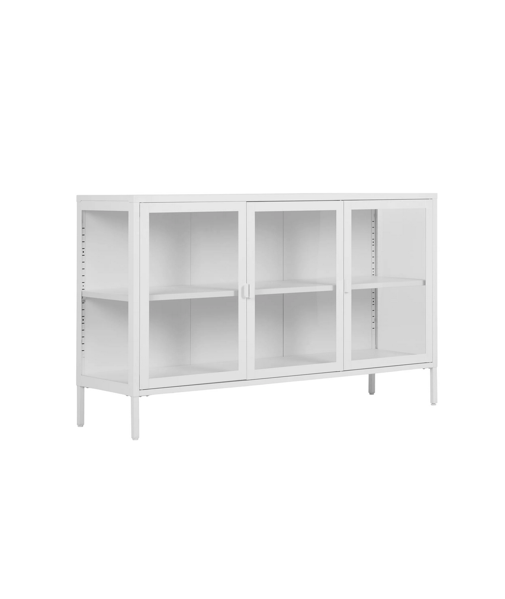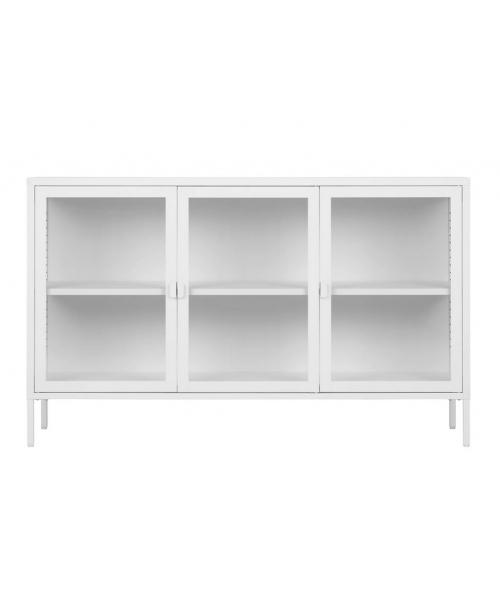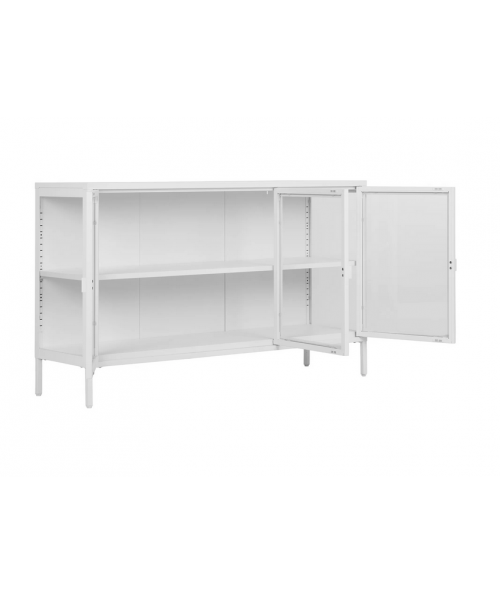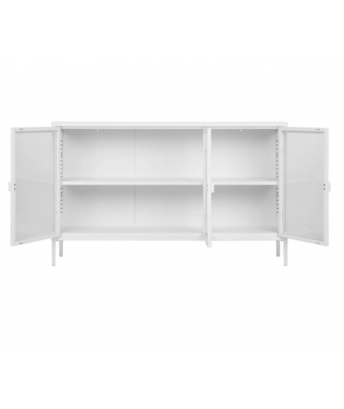 Den er fremstillet af hvidt stål, hvilket giver skænken en robust og holdbar konstruktion. De hvide metalben løfter skænken fra gulvet, hvilket skaber en let og svævende følelse i rummet, og gør det nemt at holde området omkring skænken rent.